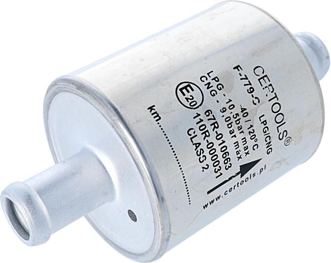 Opis produktu Filtr fazy lotnej CERTOOLS - F-779/C 14/14 mm (bibuła, jednorazowy) - jednorazowy filtr fazy lotnej F-779-C z niewymiennym wkładem firmy CERTOOLS. Opis zastosowania Filtr fazy lotnej CERTOOLS - F-779/C 14/14 mm (bibuła, jednorazowy) - jednorazowy filtr fazy lotnej montowany w części niskociśnieniowej samochodowych instalacji gazowych IV generacji (sekwencyjnych wtrysków gazu w fazie lotnej). Montowany pomiędzy reduktorem, parownikiem a czujnikiem ciśnienia i listwą wtryskiwaczy LPG, chroni te elementy przed, mogacymi pojawić się w autogazie, zanieczyszczeniami. Dane techniczne Filtr fazy lotnej CERTOOLS - F-779/C 14/14 mm (bibuła, jednorazowy): jednorazowy zespół filtra fazy lotnej LPG i CNG - zaciskany z obu stron (klasa 2), materiał obudowy (uszczelnionej o-ringami) - stop aluminium, materiał filtracyjny - bibuła (papier filtracyjny), średnica króćców - 14 mm, kierunek przepływu gazu - określony na obudowie, ciśnienie kwalifikacyjne - 450 kPa, zakres zalecanej temperatury pracy - od -40 do 120ᵒC (dla LPG), zakres zalecanej temperatury pracy - od -40 do 105ᵒC (dla CNG), homologacja na LPG - E20-67R-010663, homologacja na CNG - E20-110R-000031, zalecana wymiana - co około 10 000 km lub zgodnie z wymaganiami producenta. Cechy produktu Typ filtra: jednorazowy Model filtra: F-779/C Wkład: bibuła (papier) Wejście: 14 mm Wyjście: 14 mm Obudowa: metal Sposób montażu: na przewodzie Informacje dodatkowe Kod produktu Nagaz: 32.CRT.437 Producent: CERTOOLS Kod producenta: 53-779-01414 Numer homologacji: E20-67R-010663