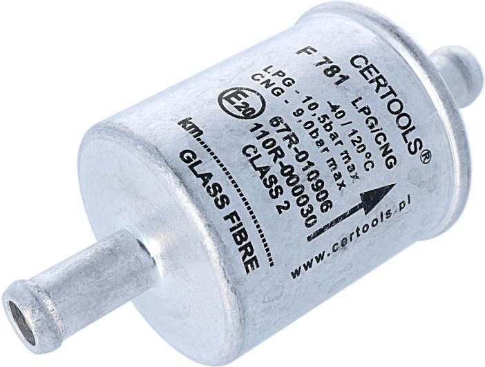 Opis produktu Filtr fazy lotnej CERTOOLS - F-781 11/11 mm (włókno szklane, jednorazowy) - jednorazowy filtr fazy lotnej F-781 firmy CERTOOLS. Opis zastosowania Filtr fazy lotnej CERTOOLS - F-781 11/11 mm (włókno szklane, jednorazowy) - stosowany w części niskociśnieniowej samochodowych instalacji gazowych IV generacji (sekwencyjnych wtryskach gazu w fazie lotnej), jednorazowy filtr fazy lotnej LPG lub CNG. Filtr fazy lotnej CERTOOLS - F-781 11/11 mm (włókno szklane, jednorazowy) - montowany pomiędzy reduktorem, parownikiem a listwą wtryskiwaczy LPG chroni je przed mogącymi pojawić się w fazie lotnej LPG zanieczyszczeniami. Dane techniczne Filtr fazy lotnej CERTOOLS - F-781 11/11 mm (włókno szklane, jednorazowy): typ - F-781, jednostronnie zaciskany, jednorazowy (z niewymiennym wkładem) zespół filtra LPG i CNG fazy lotnej, materiał obudowy - stop aluminium, długość całkowita - 98 mm, średnica króćca wejścia gazu - 11 mm, średnica króćca wyjścia gazu - 11 mm, materiał wkładu filtracyjnego - włókno szklane, kierunek przepływu gazu - określony na obudowie, ciśnienie kwalifikacyjne - 450 kPa, temperatura pracy - od -40 do 120 stopni C, homologacja na LPG - E20-67R-010906, homologacja na CNG - E20-110R-000030, zalecana wymiana - co 20 tys. km lub zgodnie z wymaganiami producenta. Cechy produktu Typ filtra: jednorazowy Wkład: włókno szklane Wejście: 11 mm Wyjście: 11 mm Obudowa: metal Sposób montażu: na przewodzie Informacje dodatkowe Kod produktu Nagaz: 32.CRT.886 Producent: CERTOOLS Kod producenta: 55-781-01111SG Numer homologacji: E20-67R-010906