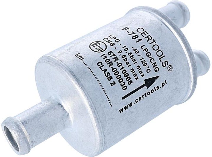 Opis produktu Filtr fazy lotnej jednorazowy. Zalecamy wymianę co 20 000 kilometrów. Opis zastosowania Stosowany w większości instalacji sekwencyjnego wtrysku gazu w fazie lotnej, poliester stosowany jako materiał filtrujący lepiej separuje zanieczyszczenia znajdujące się w gazie. Wersja dedykowana do silników w układzie boxer oraz "v". Dane techniczne Filtr fazy lotnej z króćcem wejściowym o średnicy zewnętrznej 14 milimetrów na wyjściu dwa króćce o średnicy 11 milimetrów, poliestrowy materiał filtrujący. Zakres temperatur pracy od -40 do +120 stopni Celsjusza, Maksymalne ciśnienie gazu LPG - 10,5 bar, Maksymalne ciśnienie gazu CNG - 9,5 bar, E20-67R-010906 E20-110R-000030 Cechy produktu Typ filtra: jednorazowy Wkład: poliester Wejście: 14 mm Wyjście: 2 x 11 mm Obudowa: metal Sposób montażu: na przewodzie Informacje dodatkowe Kod produktu Nagaz: 32.CRT.899 Producent: CERTOOLS Kod producenta: 55-781-014212NG Numer homologacji: E20-67R-010906
