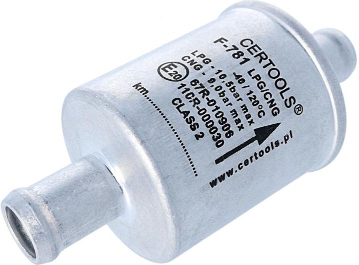 Opis produktu Filtr fazy lotnej jednorazowy. Zalecamy wymianę co 20 000 kilometrów. Opis zastosowania Stosowany w większości instalacji sekwencyjnego wtrysku gazu w fazie lotnej. Dane techniczne Filtr fazy lotnej z króćcem wejściowym o średnicy zewnętrznej 16 milimetrów na wyjściu o srednicy 14 milimetrów, papierowy materiał filtrujący. F781 zakres temperatur pracu od -40 do +120 stopni Celsjusza, Maksymalne ciśnienie gazu LPG - 10,5 bar, Maksymalne ciśnienie gazu CNG - 9,5 bar, E20-67R-010906 E20-110R-000030 Cechy produktu Typ filtra: jednorazowy Wkład: bibuła (papier) Wejście: 16 mm Wyjście: 14 mm Obudowa: metal Sposób montażu: na przewodzie Informacje dodatkowe Kod produktu Nagaz: 32.CRT.888 Producent: CERTOOLS Kod producenta: 55-781-01614G Numer homologacji: E20-67R-010906