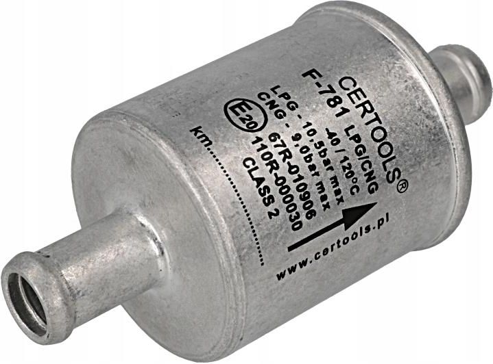 Filtr fazy lotnej CERTOOLS - F-781 14/14 mm Opis produktu: Filtr fazy lotnej CERTOOLS - F-781 14/14 mm (włókno szklane, jednorazowy) - jednorazowy filtr fazy lotnej F-781 firmy CERTOOLS z niewymiennym wkładem. Opis zastosowania: Filtr fazy lotnej CERTOOLS - F-781 14/14 mm (włókno szklane, jednorazowy) - filtr fazy lotnej stosowany w części niskociśnieniowej samochodowych instalacji gazowych IV generacji (sekwencyjnych wtrysków gazu w fazie lotnej), montowany pomiędzy reduktorem, parownikiem a czujnikiem ciśnienia i listwą wtryskiwaczy LPG, chroni te elementy przed zanieczyszczeniami mogącymi pojawić się w autogazie. Dane techniczne: Filtr fazy lotnej CERTOOLS - F-781 14/14 mm (włókno szklane, jednorazowy): materiał obudowy - stop aluminium, materiał filtracyjny - włókno szklane, długość całkowita - 98 mm, średnica króćców - 14 mm, kierunek przepływu gazu - określony na obudowie, ciśnienie kwalifikacyjne - 450 kPa, zakres zalecanej temperatury pracy - od -40 do 120ᵒC, homologacja na LPG - E20-67R-010906, homologacja na CNG - E20-110R-000030, zalecana wymiana - co około 20 000 km lub zgodnie z zaleceniami producenta. Cechy produktu Typ filtra: jednorazowy Wkład: włókno szklane Wejście: 14 mm Wyjście: 14 mm Obudowa: metal Sposób montażu: na przewodzie Informacje dodatkowe Kod produktu Nagaz: 32.CRT.868 Producent: CERTOOLS Kod producenta: 55-781-01414SK Numer homologacji: E20-67R-010906
