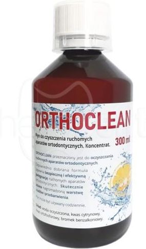 ORTHOCLEAN - koncentrat do czyszczenia ruchomych aparatów ortodontycznych Orthoclean to rewolucyjny płyn do czyszczenia ruchomych aparatów ortodontycznych, który został zaprojektowany, aby utrzymać ich higienę i świeżość. Posiada odpowiednio dobraną formułę oraz składniki wysokiej jakości, dzięki czemu skutecznie usuwa bakterie, osad i nieprzyjemny zapach z aparatu ortodontycznego. Najważniejsze cechy płynu do czyszczenia ruchomych aparatór ortodontycznych Orthoclean: SKUTECZNOŚĆ: zaawansowana formuła płynu działa głęboko, eliminując bakterie, co pomaga zapobiec różnym problemom zdrowotnym. BEZPIECZEŃSTWO: płyn jest wolny od szkodliwych składników, takich jak alkohol, parabeny czy SLS, co sprawia, że jest delikatny, a jednocześnie skuteczny w walce z bakteriami. ŁATWOŚĆ UŻYCIA: wystarczy zanużyć aparat w rostworze na około 5-20 minut, a następnie dokładnie go spłukać pod bieżącą wodą. Prosty i szybki sposób na zachowanie higieny aparatu. SMAK I ZAPACH: płyn posiada przyjemny, świeży smak i zapach. WIELOFUNKCYJNOŚĆ: płyn jest odpowiedni do czyszczenia wszystkich rodzajów ruchomych aparatów ortodontycznych, takich jak: aparaty retencyjne, alignery, protezy czy inne urządzenia stomatologiczne. OPAKOWANIE: praktyczne i łatwe w używiu opakowanie Orthoclean pozwala na precyzyjne dozowanie płynu oraz bezpieczne przechowywanie. Przeznaczony do czyszczenia ruchomych aparatów ortodontycznych. Posiada odpowiednio dobraną formułę, która zapewnia bezpieczną i efektywną pielęgnację. Skutecznie usuwa nagromadzoną warstwę osadów i przebarwienia. Sposób użycia płynu Orthoclean: 10-20 ml płynu wlać do ½ szklanki ciepłej wody, Do płynu włożyć aparat, tak aby cały zanurzony był w płynie, Pozostawić aparat w roztworze na 5-20 minut, Wyjąć aparat z roztworu i opłukać pod bieżącą wodą. Woda oczyszczona, kwas cytrynowy, kwas ortofosforowy, bromek benzalkoniowy. Opakowanie: 300ml