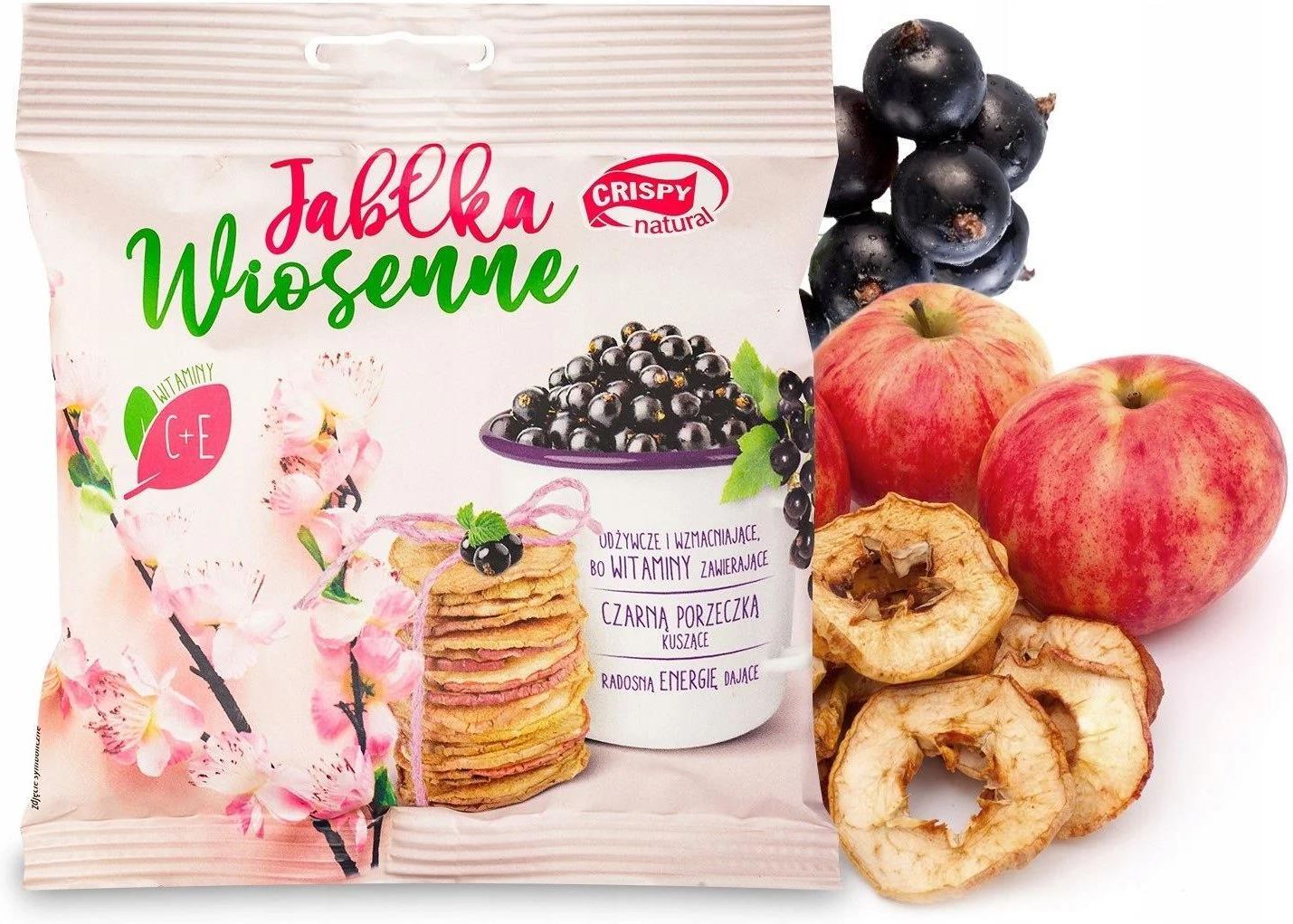 Wiosenna energia z nowego smaku! Jabłka Wiosenne to wyjątkowe połączenie chrupiących, suszonych chipsów jabłkowych z dodatkiem soku z czarnej porzeczki. Ta pyszna i niezwykle chrupiąca przekąska wzbogacona została o porcję WITAMIN C oraz E! Witamina C wzmacnia naszą odporność, a witamina E pozytywnie wpływająca na wygląd naszej skóry. Pobudzające, świeże i niezwykle aromatyczne połączenie smaków daje nam porcję pozytywnej energii na wiosenny czas, kiedy wszystko rodzi się na nowo.