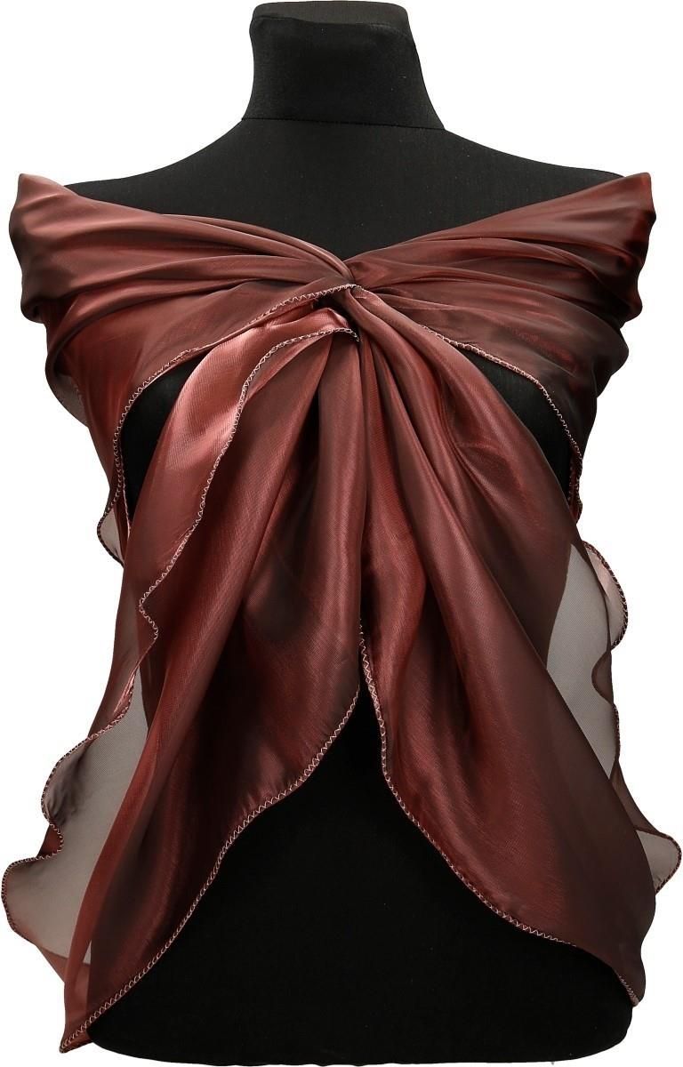 Elegancka, lekka, półprzezroczysta chusta. Została uszyta z połyskującej organzy. Stanowi doskonałe uzupełnienie kreacji wieczorowych. Bogata oferta kolorystyczna, pozwala na wybór najodpowiedniejszego koloru, pasującego idealnie zarówno do sukienki jak i urody właścicielki. PRODUKT POLSKI kupując polskie marki wspierasz rozwój rodaków. Polska rośnie w siłę.