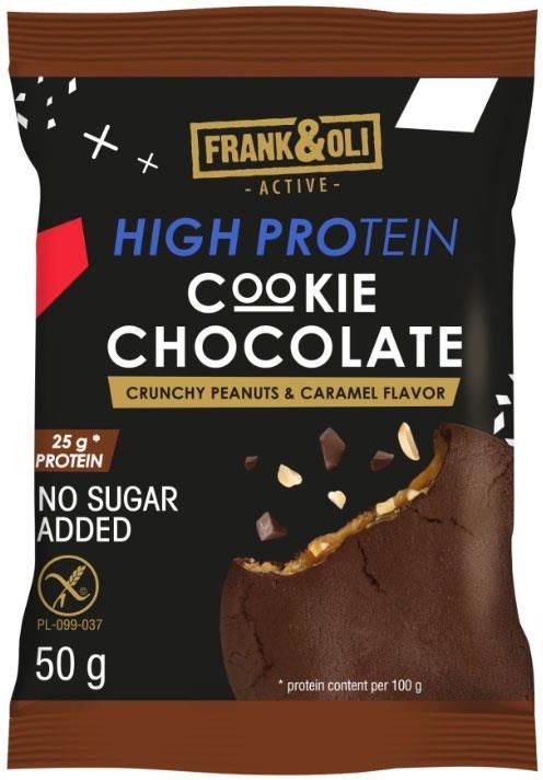 FRANK&OLI Ciastko Proteinowe Czekoladowe ORZECHY ZIEMNE KARMEL 50g Poczuj prawdziwą moc białka w wyjątkowej, smakowitej formie! High Protein Chocolate Crunchy Peanuts & Caramel to dopracowana kompozycja intensywnego kakao, ciemnej czekolady i chrupiących orzeszków arachidowych, wzbogacona słodkim nadzieniem o karmelowej nucie. To nie tylko pyszna przekąska, ale także solidna porcja wartości odżywczych – w jednej porcji znajdziesz aż 13 g białka serwatkowego, które wspiera regenerację mięśni i daje uczucie sytości na dłużej. Dzięki naturalnym składnikom, błonnikowi i braku dodatku cukru, ciastko idealnie sprawdzi się po treningu, w pracy czy w podróży, zastępując klasyczne słodycze zdrowszą, bardziej funkcjonalną alternatywą. Wysokoproteinowe ciastko – 13g białka w porcji Wysoka zawartość białka oraz błonnika pokarmowego sprawiają, że ciastko High Protein Cookie Chocolate Crunchy Peanuts & Caramel to nie tylko szybka przekąska, ale również wartościowy element diety osób trenujących, pracujących fizycznie lub żyjących w biegu. Ciastko składa się m.in. z białka serwatkowego WPC 80, błonnika z cykorii, orzeszków arachidowych, ciemnej czekolady bez cukru. Taka kompozycja wspiera regenerację, syci na dłużej i... naprawdę smakuje! Proteinowe ciastko orzechowo-karmelowe od Frank&Oli Każdy kęs tego ciastka to harmonijne połączenie kremowego nadzienia o smaku karmelu z wyraźnym akcentem orzeszków ziemnych i intensywnie czekoladowym finiszem. W strukturze wyczuwalne są chrupiące kawałki orzechów i delikatnie obsuszone brzegi, które przyjemnie kontrastują z miękkim wnętrzem. Aromat? Apetyczny – pełen kakao, orzeszków i subtelnego białka serwatkowego. Ciastko wysokobiałkowe bez cukru, bez kompromisów Bez dodatku cukru, bez glutenu, bez sztucznych dodatków. Ciastko High Protein Chocolate Crunchy Peanuts & Caramel nie tylko rozpieszcza zmysły, ale też dba o Twoje zdrowie. Maltitol jako substancja słodząca sprawia, że możesz cieszyć się słodyczą bez wyrzutów sumienia. Skład: błonnik z korzenia cykorii, miazga z orzeszków arachidowych, nadzienie 25 % [miazga z orzeszków arachidowych, błonnik z korzenia cykorii, orzeszki arachidowe 19 %, koncentrat białka serwatkowego WPC 80 (z mleka) 10 %, ciemna czekolada bez cukru 5 % [substancja słodząca: maltitol, tłuszcz kakaowy, kakao, emulgator: lecytyny (z rzepaku), naturalny aromat] koncentrat białka serwatkowego WPC 80 (z mleka) 20 %, kakao, olej słonecznikowy, emulgator: lecytyny (z rzepaku), naturalny aromat, sól himalajska. Alergeny: Produkt może zawierać nasiona sezamu i orzechy.