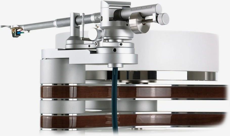 Specyfikacja Rodzaj napędu paskowy Obsługiwane prędkości odtwarzania 33, 45, 78 Wyjścia dodatkowe nie Bluetooth nie Pobór mocy (max) 9.5 W Pobór mocy (standby) 2.4 W Wymiary (S x W x G) mm 460 x 485 x 396 Waga kg 60 Master Innovation to zaawansowany model firmy Clearaudio, przeznaczony dla prawdziwych koneserów dobrego brzmienia. Jest to piętrowa konstrukcja, wyposażona w dodatkowy talerz napędowy. Między elementami nośnymi znajduje się wolna przestrzeń, co pozwala zredukować niepożądane rezonanse, a tym samym zmniejszyć zniekształcenia w odtwarzanym sygnale. Co warte podkreślenia, model Master Innovation ma możliwość instalacji aż trzech ramion gramofonowych. Solidny dwuwarstwowy talerz Dynamicznie wyważony talerz w modelu Master Innovation jest dwuwarstwowy. Pierwsza warstwa ma grubość 70 mm i jest wykonana z polimeru, a pod nią znajduje się 15-milimetrowa warstwa ze stali nierdzewnej. Taka konstrukcja spełnia najwyższe standardy pod względem mechanicznym – jest niezwykle stabilna i chroni przez niepożądanymi wibracjami. Łożysko CMB W gramofonie Clearaudio Master Innovation zastosowano ceramiczne łożysko magnetyczne CMB (Ceramic Magnet-Bearing). W połączeniu z dodatkowym kołem zamachowym i silnikiem prąd stałego o wysokim momencie obrotowym pozwoliło to osiągnąć niesamowitą stabilność prędkości obrotu talerza. Optyczna kontrola prędkości Czujnik wykorzystujący podczerwień wysyła sygnały do optycznego mechanizmu kontroli prędkości, aby konsekwentnie utrzymywać idealną prędkość obrotów talerza, podczas gdy bezdotykowe odsprzęganie magnetyczne napędu zapobiega przedostawaniu się jakichkolwiek wibracji lub hałasu z systemu silnika do głównej części gramofonu. W rezultacie eliminowane są wszelkie wahania prędkości i uzyskiwana jest idealna wysokość odtwarzanego dźwięku. Najważniejsze cechy modelu Clearaudio Master Innovation Piętrowa konstrukcja z dodatkowym talerzem Napęd paskowy Konstrukcja zoptymalizowana pod kątem redukcji rezonansów Dwuwarstwowy talerz główny, wykonany z polimeru i stali nierdzewnej Możliwość instalacji nawet trzech ramion gramofonowych Obsługa trzech prędkości obrotu płyty: 33 1/3, 45 i 78 obr./min Ceramiczne łożysko magnetyczne (CMB, od ang. Ceramic Magnet-Bearing) Optyczna kontrola prędkości (OSC) Wykonany na zamówienie silnik 24 V DC o wysokim momencie obrotowym Precyzyjnie regulowane nóżki gramofonu