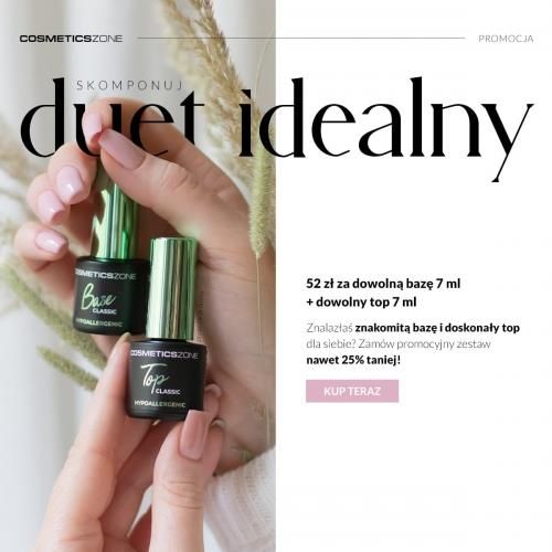 IDEALNY DUET - BAZA HYBRYDOWA 7ml + TOP HYBRYDOWY 7ml Zestaw promocyjny baza do hybrydy + top to doskonała okazja na uzupełnienie zapasów w Twoim kuferku. Wybierz ulubioną bazę hybrydową i dobierz dowolny top. Na takim zestawie oszczędzasz nawet 18zł!Wybierając zestaw promocyjny, samodzielnie komponujesz swój idealny duet. Do Ciebie należy wybór bazy i topu. Zestaw obowiązuje na produkty o pojemności 7ml :) ZESTAW HYBRYDOWY "IDEALNY DUET 7ml! DOWOLNA BAZA + DOWOLNY TOP" ZAWIERA: - dowolna baza hybrydowa Cosmetics Zone 7ml - 1 sztuka - dowolny top hybrydowy Cosmetics Zone 7ml - 1 sztuka Jest to optymalna kombinacja produktów najwyższej jakości stworzona specjalnie dla Ciebie :) Wybierz swoje ulubione produkty z kolekcji Cosmetics Zone i ciesz się pięknym manicure!