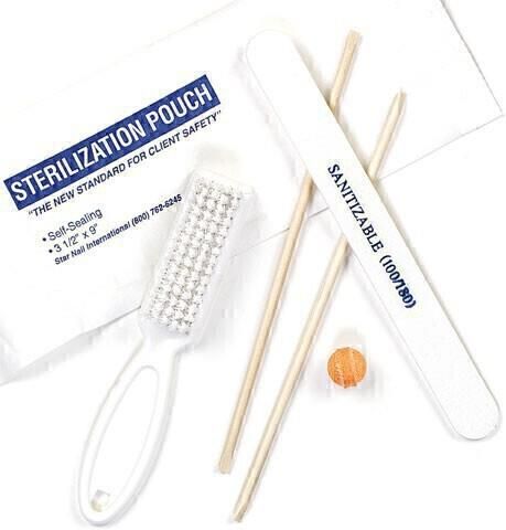 Jednorazowy zestaw sanitarny dla klientki do manicure naturalnego: dwa patyczki z drzewa brzozowego kuleczki musującej szczoteczki pilnika o gradacji 100/180 Pamiętaj o bezpieczeństwie i higienie w swoim gabinecie!