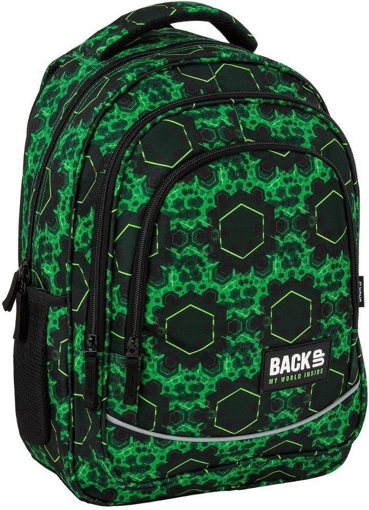 Plecak szkolny BackUP Quantum dla chłopca czarny zielony geometryczny X45 Wprowadź do swojego codziennego looku nutę nowoczesności z plecakiem z kolekcji Quantum! Tajemniczy motyw heksagonów w różnych rozmiarach i odcieniach zieleni tworzy futurystyczną kompozycję, która przyciąga wzrok i dodaje stylizacjom dynamiki oraz świeżości. Intensywne, żywe barwy efektownie kontrastują z ciemnym tłem, budując wyrazisty, energetyczny design – idealny dla miłośników odważnych, geometrycznych wzorów i nowoczesnych rozwiązań. Plecak BackUP Quantum to idealny towarzysz do szkoły, na uczelnię, wyjazdy czy codzienne aktywności. Dzięki przemyślanej konstrukcji i wysokiej jakości wykonaniu, zapewnia wygodę, trwałość i doskonałą organizację przestrzeni. Dlaczego warto wybrać plecak BackUP Quantum? 3 pojemne komory – umożliwiają swobodne rozmieszczenie książek, zeszytów, ubrań i innych niezbędnych rzeczy. 2 boczne kieszenie – praktyczne miejsca na bidon lub napój. Funkcjonalne wnętrze – w pierwszej komorze specjalne kieszenie do bezpiecznego przechowywania laptopa i tabletu. Wygodny organizer w przedniej komorze – kieszonka z siateczki na zamek, uchwyt na klucze, przegródki na długopisy, miejsce na legitymację oraz większa kieszeń na drobne akcesoria, chusteczki czy płyn antybakteryjny. Ergonomiczne, usztywnione plecy – wyprofilowane oddychającą pianką, zapewniają komfort noszenia nawet przy dużym obciążeniu. Miękkie, profilowane szelki z regulacją długości – dla idealnego dopasowania i odciążenia pleców. Wzmocnione, czarne dno – odporne na przetarcia i codzienne użytkowanie. Solidna rączka do przenoszenia oraz dodatkowy uchwyt do wygodnego powieszenia plecaka. Elementy odblaskowe na froncie i szelkach – zwiększające bezpieczeństwo po zmroku. Specyfikacja techniczna Wymiary: 42 x 30 x 20 cm – optymalna wielkość do szkoły i na co dzień. Waga: 650 g – lekki i wygodny w noszeniu. Kolekcja: Quantum.