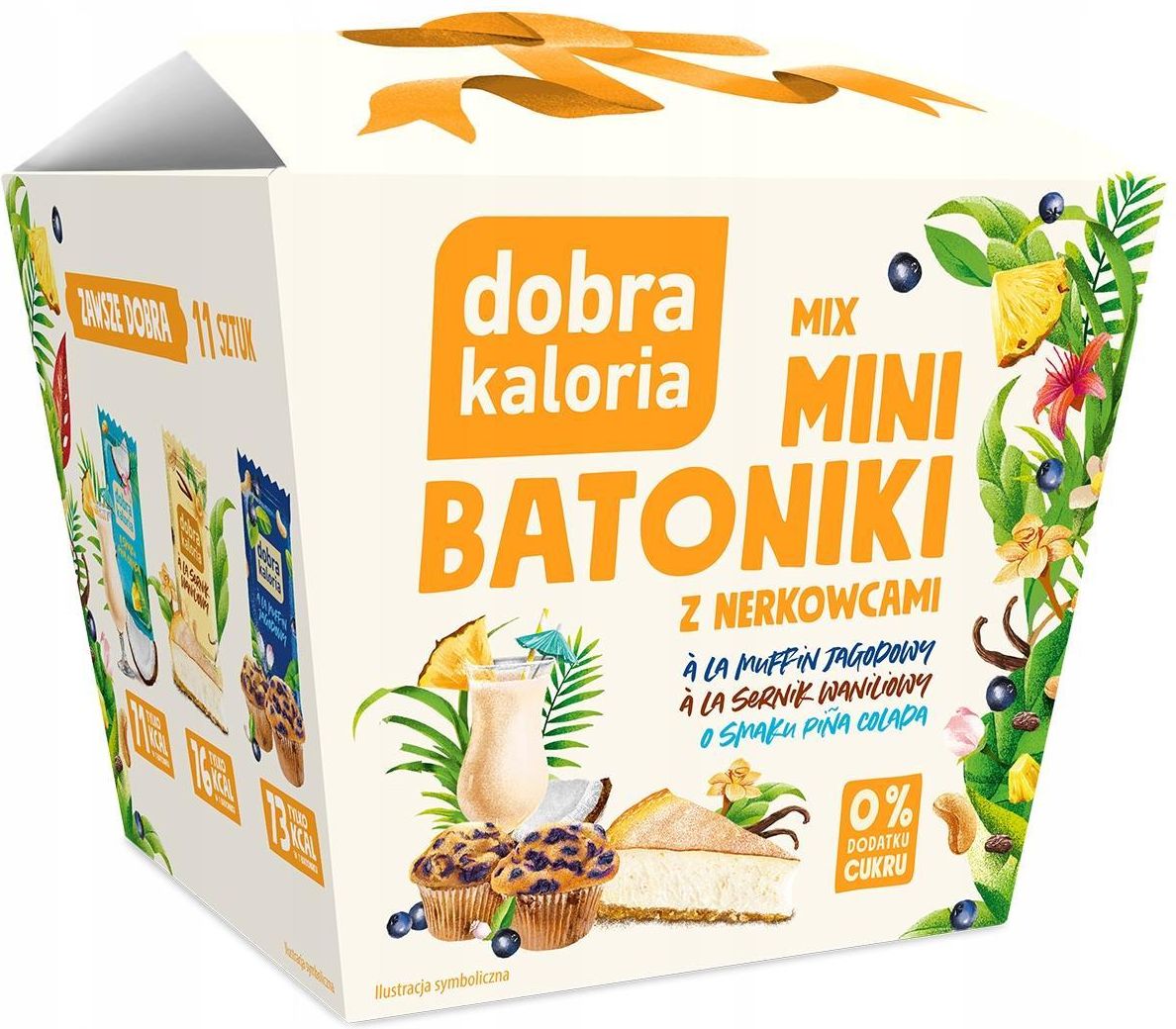 Mini Batoniki Dobra Kaloria Mix smaków ✅Gotowy prezent pełen #dobra ✅0 % dodatku cukru ✅Mniej, niż 80 kcal w batoniku ✅Źródło potasu, magnezu i błonnika ✅Prosty skład ✅Odpowiedni dla wegan & wegetarian ✅Ozdobne opakowanie W skład zestawu wchodzą: ✅Mini batoniki muffin jagodowy ✅Mini batoniki sernik waniliowy ✅Mini batoniki pina colada Jak smakują mini Batoniki Dobrej Kalorii ✅Muffin Jagodowy: Batoniki à la muffin jagodowy mają smak przypominający słodkie muffiny jagodowe, z wyraźnym aromatem jagód. Są one lekko kwaskowate i owocowe, co daje orzeźwiający efekt. Dzięki zawartości orzechów nerkowca i suszonych owoców, batonik jest jednocześnie chrupiący i miękki, co sprawia, że idealnie nadaje się na szybki, zdrowy snack ✅Piña Colada: Te batoniki oferują tropikalny smak inspirowany klasycznym koktajlem Piña Colada. Dominują tu nuty ananasa i kokosa, które nadają batonikowi świeży, słodki smak z delikatnym, egzotycznym akcentem. Idealnie nadają się na letnie przekąski lub gdy masz ochotę na coś przypominającego wakacje​ ✅Sernik Waniliowy: Batoniki à la sernik waniliowy mają kremowy, słodki smak z wyraźną nutą wanilii. Ich konsystencja jest miękka dzięki orzechom nerkowca i daktylom, co daje wrażenie jedzenia lekkiego deseru sernikowego. Są one delikatnie słodzone naturalnymi składnikami, co sprawia, że są smaczne, ale nie przesadnie słodkie Skład i wartości odżywcze ✅MINI BATONIKI Z NERKOWCAMI À LA MUFFIN JAGODOWY. Składniki: orzechy nerkowca (34 %), rodzynki (28 %), pasta daktylowa, orzechy nerkowca prażone (5 %), chrupki komosowe (komosa ryżowa, błonnik z cykorii), jagody czarne liofilizowane (1 %), naturalny aromat. Tylko 73 kcal w batoniku. ✅MINI BATONIKI Z NERKOWCAMI À LA SERNIK WANILIOWY. Składniki: orzechy nerkowca (40 %), rodzynki (27 %), pasta daktylowa, orzechy nerkowca prażone (5 %), mielona ekstrahowana laska wanilii (0,5 %), naturalny aromat. Tylko 76 kcal w batoniku. ✅MINI BATONIKI Z NERKOWCAMI O SMAKU PIÑA COLADA.Składniki: pasta daktylowa (28 %), rodzynki (28 %), orzechy nerkowca (22 %), wiórki kokosowe (12 %), orzechy nerkowca prażone (5 %), chrupki komosowe (komosa ryżowa, błonnik z cykorii), ananas liofilizowany (1 %), naturalny aromat.Tylko 71 kcal w batoniku. Zabierz je wszędzie! Mini batoniki Dobra Kaloria kokos i czekolada to idealna przekąska zarówno dla młodszych, jak i starszych. Dzięki swojemu naturalnemu składowi i wyjątkowemu smakowi, doskonale sprawdzają się w różnych sytuacjach: ✅W biurze: Dzięki kompaktowym rozmiarom i wygodnemu opakowaniu, mini batoniki można łatwo przechowywać w biurowej szufladzie lub torbie. Zapewniają one szybki zastrzyk energii i są zdrową alternatywą dla tradycyjnych słodyczy, co może być pomocne w walce z popołudniowym spadkiem energi ✅Na wycieczce w górach: Te batoniki są idealne na długie wędrówki i wycieczki górskie. Dzięki zawartości daktyli, kokosa i orzechów, dostarczają one trwałej energii, a ich naturalne cukry pomagają w szybkim uzupełnieniu poziomu glukozy we krwi po intensywnym wysiłku ✅Na siłowni: Mini batoniki Dobra Kaloria są również świetnym wyborem przed lub po treningu na siłowni. Wysoka zawartość białka i błonnika pomaga w regeneracji mięśni i zaspokojeniu głodu, bez zbędnych dodatków cukru ✅Podczas podróży: Mini batoniki są praktyczne i nie zajmują dużo miejsca, co czyni je idealnym towarzyszem podróży. Można je łatwo schować w plecaku czy torebce i sięgnąć po nie w każdej chwili, gdy pojawi się potrzeba szybkiego posiłku.