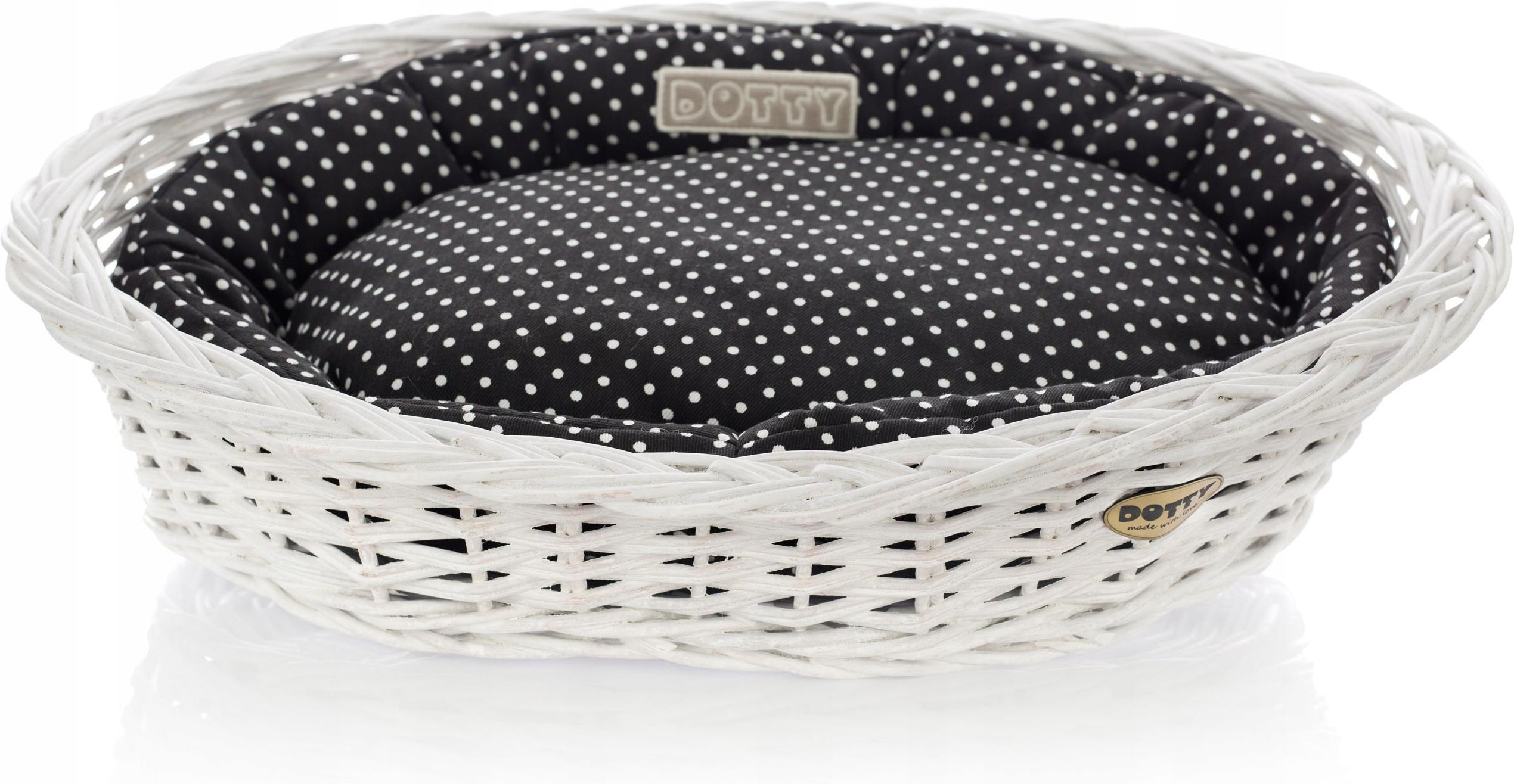 Legowisko DOTTY - w koszyku wiklinowym bielonym Wzór: czarny w białe groszki Rozmiar 55 XS Wymiary zewnętrzne przybliżone ok. 55x42 Wymiary wewnętrzne przybliżone (mierzone na dnie) ok. 40x27 Legowisko składa się z dwóch elementów - obrzeża z dnem i poduszki, oba są wyjmowane i nadają się do prania …