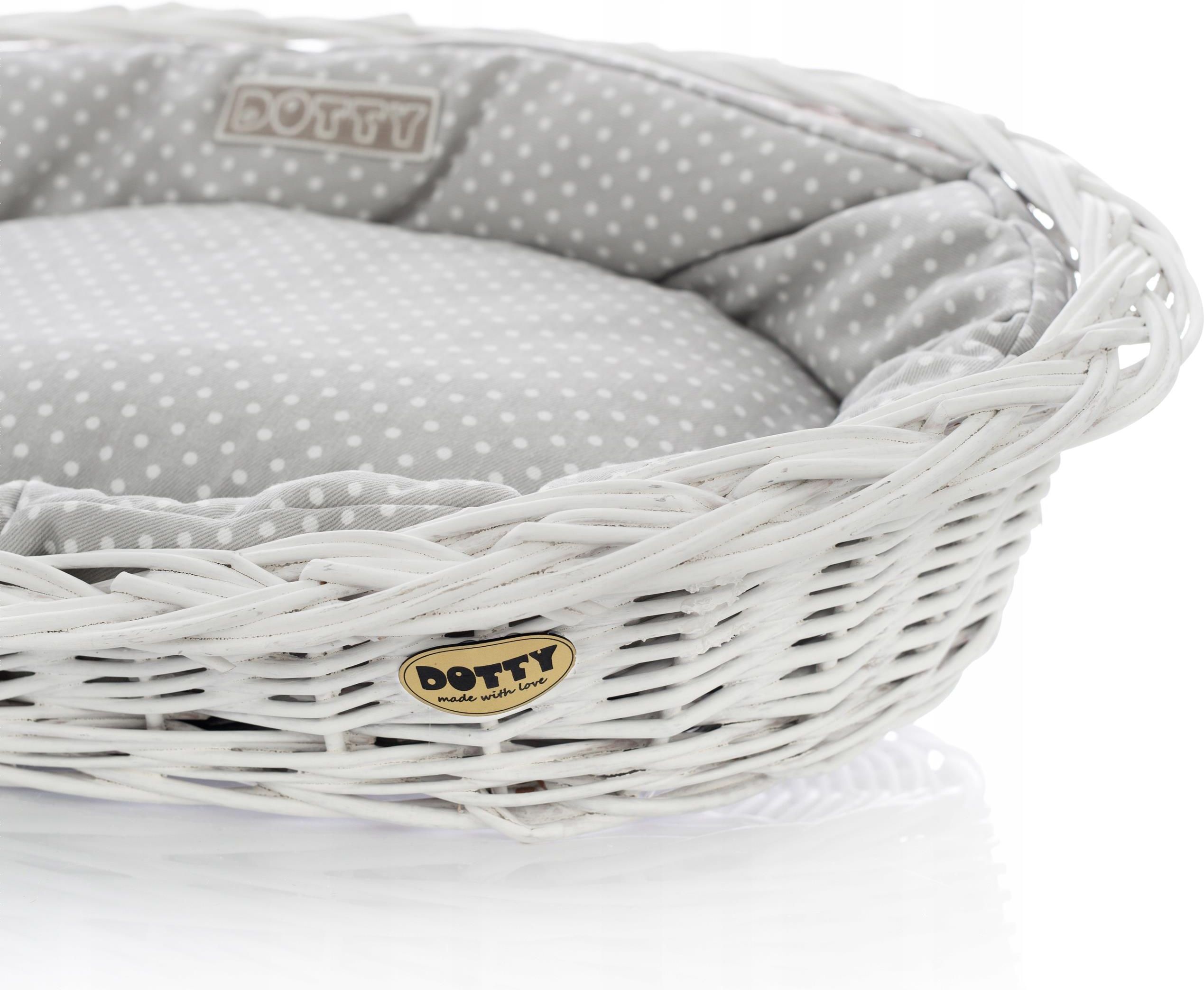 Legowisko DOTTY - w koszyku wiklinowym bielonym Wzór: szary w białe groszki Rozmiar 75 M Wymiary zewnętrzne przybliżone ok. 75x53 Wymiary wewnętrzne przybliżone (mierzone na dnie) ok. 60x37 Legowisko składa się z dwóch elementów - obrzeża z dnem i poduszki, oba są wyjmowane i nadają się do prania w …