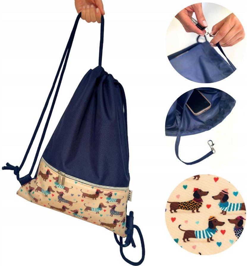 Plecakoworek DOTTY - granatowy z beżową kieszenią w jamniki Wymiary 48cm x 35cm - wymiary plecaka mierzone na płasko 2 x 75cm - długość sznurka po ściągnięciu (zamknięciu) worka Wykonanie praktyczna kieszeń zewnętrzna zapinana na ekspres - idealna na drobiazgi lub smaczki dla pieska kieszeń …