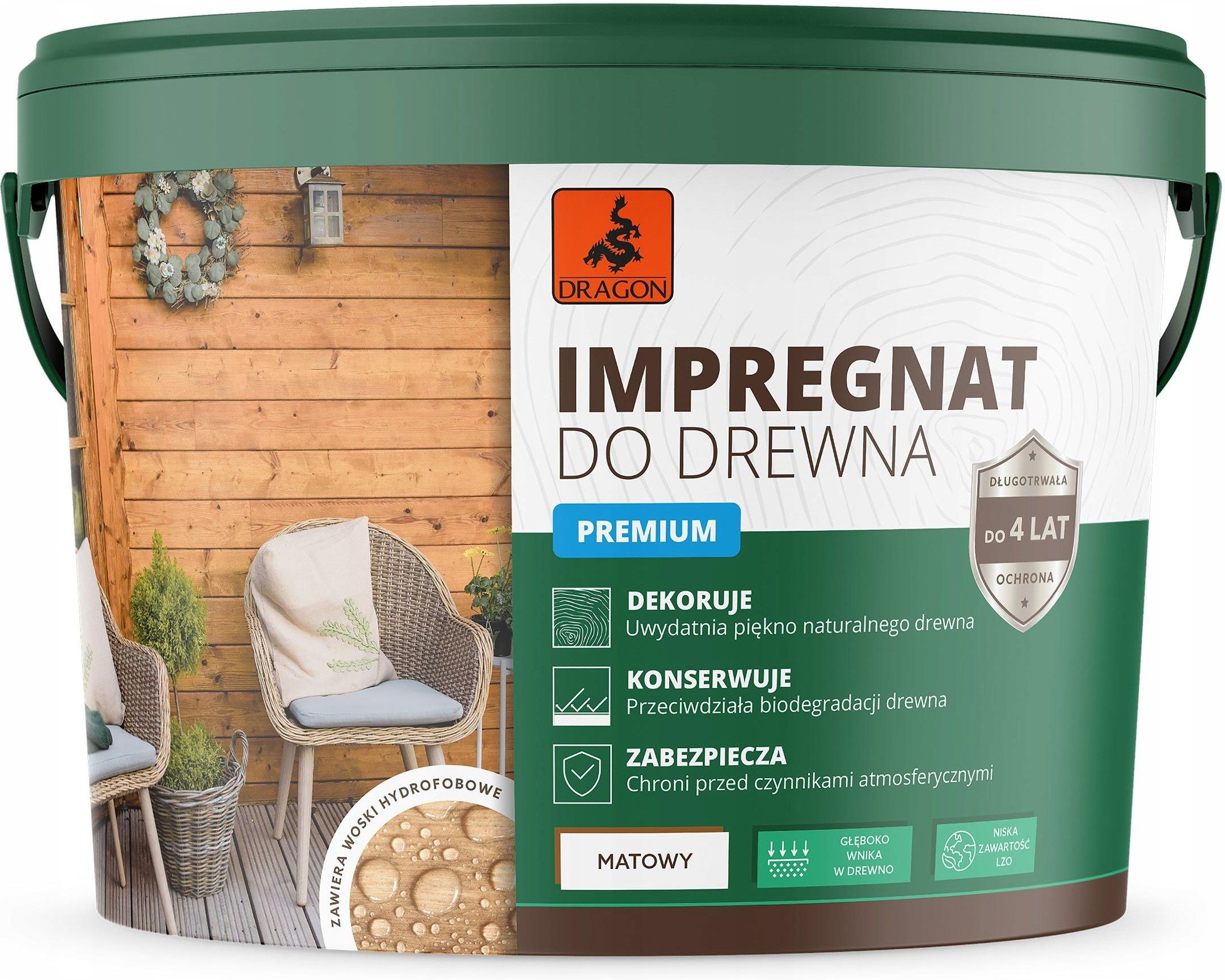 DRAGON Impregnat Akrylowy do Drewna 5L TEAK Szybkoschnący impregnat ochronny i dekoracyjny do drewna, będący mieszaniną dyspersji akrylowej, wosków szlachetnych i wypełniaczy oraz środków wzmacniających odporność drewna na czynniki zewnętrzne. Nadaje drewnu matowe, barwne wykończenie zachowując …