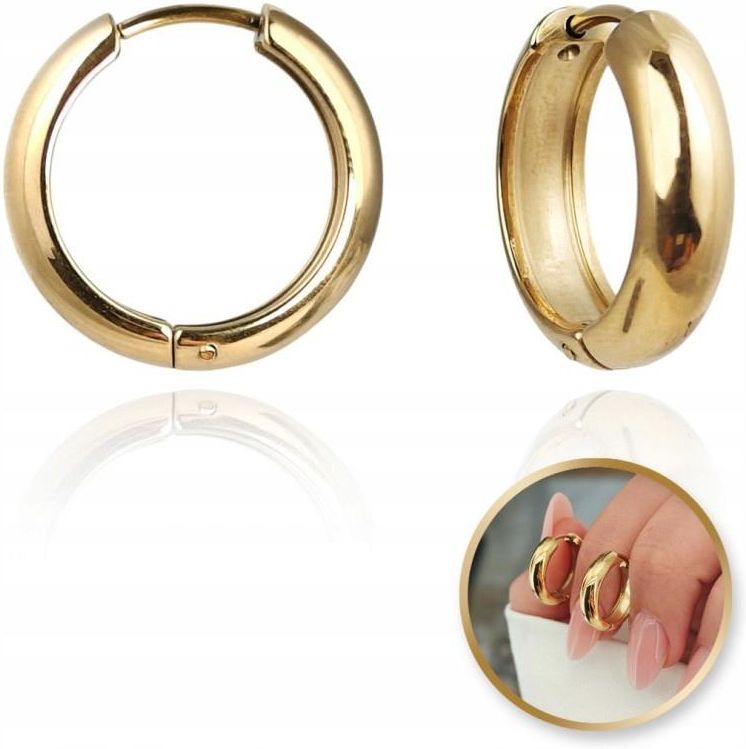 Ecarla kolczyki ze stali szlachetnej platerowane 14k złotemEleganckie i stylowe kolczyki zostały wykonane ze stali szlachetnej, a następnie pokryte 14-karatowym złotem. Ich wymiary to 1,9 cm długości, 1,8 cm szerokości i 0,5 cm grubości. Kolor biżuterii to jasne złoto, a waga netto wynosi 6 g (9 g brutto). Kolczyki posiadają praktyczne zapięcie typu szarnir.Warto podkreślić, że użyta stal chirurgiczna jest niezwykle odporna na niekorzystne warunki atmosferyczne, nie koroduje, nie rdzewieje ani nie śniedzieje, co zapewnia trwałość i piękny wygląd biżuterii na długi czas.1 para kolczyków = 2 sztuki.
