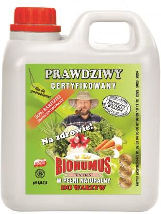 Biohumus Extra nawóz w płynie do warzyw 2L Jest to w pełni naturalny, płynny nawóz przeznaczony do upraw warzyw. Dzięki zawartości bogatej mikroflory bakteryjnej oraz próchnicy pokarmowej produkt znakomicie wpływa na wzrost, kondycję i zdrowie warzyw, poprawia ich walory smakowe i jakościowe, powoduje lepsze ukorzenienie, szybszy start nasion i zdrowy rozwój roślin. Pojemność: 2LOpakowanie: plastikowa butelka Producent: EKODARPOLPRODUKT POLSKI