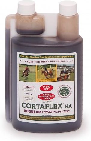 EQUINE AMERICA Cortaflex HA Regular Solution 1 l - suplement dla koni Cortaflex od wielu lat jest wiodącym preparatem dla ochrony stawów i ścięgien przed urazami. Teraz Cortaflex HA Regular jest dodatkowo wzmocniony ASU i krzemem. Swoją dużą skuteczność zawdzięcza min zastosowaniem rewolucyjnych izolatów glukozaminy i chondroityny oraz niskocząsteczkowemu kwasowi hialuronowemu HA oraz kwasowi glukuronowemu. Zastosowanie CORTAFLEX® skutecznie zapobiega rozwinięciu się niekorzystnych procesów chorobowych (zaburzenia w ukrwieniu i odżywianiu, zapalenie) powstających w wyniku urazu. CORTAFLEX® ma zastosowanie profilaktyczne - zapobiegawcze i wspomagające terapię schorzeń stawów. Szczególnie polecany jest dla młodych dorastających koni w pierwszej fazie treningów. Regularne podawanie Cortaflexu znacznie obniża ryzyko wystąpienia urazów stawów i ścięgien u koni rozpoczynających karierę sportową. Cortaflex z powodzeniem stosowany jest też u koni seniorów, zwiększając komfort życia. Cortaflex w sposób naturalny uzupełnia i zabezpiecza stawy podczas wysiłku, eliminuje mikrourazy powstałe na skutek przeciążeń treningowych. Cortaflex nie uzależnia konia. MITEM jest określenie, że jeśli podaję młodemu koniowi teraz preparaty to co będzie za 5 lat. Otóż podając młodemu dorastającemu koniowi, z utwardzającym się dopiero układem kostnym zapewniamy mu profesjonalną ochronę w okresie dojrzewania. Cortaflex hamuje procesy zapalne, przez co zapobiega powstaniu chorobowych procesów zwyrodnieniowych stawów. Od niedawna Cortaflex – podstawowy dostępny jest w PŁYNIE w postaci słodkiego syropu - opakowanie 1 l lub 3,8 l. Preparat w płynie jest skuteczną alternatywą dla koni „rozsypujących” jedzenie ze żłobu. Prosta forma podania gwarantuje, że 100% podanej dawki trafi do przewodu pokarmowego. Działanie - Optymalne zaopatrzenie stawów w substancje odżywcze - Hamuje aktywność mediatorów zapalnych -zmniejsza ryzyko trwałych uszkodzeń stawów przy przeciążeniach - Wpływa na zapewnienie właściwej gęstości kwasu HA w stawach - Eliminuje mikrostany zapalne powstające na skutek obciążeń treningowych - Polepsza mikrokrążenie w tkance kostnej podchrząstkowej i w torebce stawowej, - Przyśpiesza procesy regeneracji chrząstki stawowej Wskazania do stosowania CORTAFLEX®’u - Młode konie dla wzmocnienia i prawidłowego rozwoju stawów szczególnie u koni szybko rosnących. - W okresie pierwszych treningów i startów - U koni starszych celem zapewnienia stabilności i normalnej elastyczności stawów Dla koni wyczynowych, starszych regularnie trenujących i startujących w zawodach zdecydowanie polecamy CORTAFLEX HA SUPER STRENGTH o silniejszym składzie. Nie zwiera substancji zakazanych Nie jest uważny za doping Analiza: Białko surowe 6.60% Oleje i tłuszcze surowe 0,56% Włókno surowe 0,10% Popiół surowy 0,86% Wilgotność 79,00% Awokado Soja (ASU) 3,30% Sód 0,05% Kwas monokrzemowy 0,025% Skład: Woda, D-glukoza -40000mg/kg, izolat białka sojowego, awokado, soja (Avocado Soybean Unsaponifiables ASU), hydrolizat kolagenu, ekstrakt z brzozy - 1400mg/kg,kwas monokrzemowy, siarka. Przeciwutleniacze: Kwas askorbinowy - E300-200mg/kg. Zagęstnik: Guma ksantanowa - E415-4000mg/kg. Witaminy: chlorowodorek pirydoksyny. Związki pierwiastków śladowych: jednowodny siarczan manganu- E5 - 200mg/kg, pięciowodny siarczan miedzi - E4 - 25mg/kg. Aminokwasy: glicyna, L-glutamina, kwas glutaminowy,L-prolina, kwas asparaginowy, L-arginina, L-histydyna, L-alanina, L-seryna, L-walina, L-izoleucyna. Dodatki technologiczne: Konserwanty: propionian amonu- E280-1000mg/kg Dawkowanie: Konie 500 kg - 30 ml dziennie z paszą lub bezpośrednio do pyska. Pozostałe konie adekwatnie do wagi. Maksymalna dzienna dawka - 30 ml.