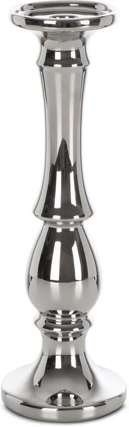 Świecznik JOLY wykonany z glinki ceramicznej, o srebrnej powierzchni, która nadaje mu elegancki, lustrzany połysk. Jest smukły, o klasycznym kształcie z subtelnymi zakrzywieniami oraz zwężeniami wzdłuż trzonu, co nadaje mu elegancki, dekoracyjny charakter. Jego podstawa jest stabilna i szeroka, zapewniając równowagę, a górna część ma miejsce na umieszczenie świecy. Odpowiednio dobrany świecznik doda blasku i stworzy atmosferę przytulności i relaksu we wnętrzu. Świecznik podkreśli też indywidualny styl twojego mieszkania. Świeczniki o rożnych kształtach i kolorach wspaniale uzupełnią aranżacją salonu czy pokoju dziennego. Kolacja przy świecach - jak najbardziej, ale znajdź godną oprawę dla swoich świec w postaci modnego świecznika. Świecznik lub zestaw świeczników to wspaniały element dekoracji każdego wnętrza: salonu, kuchni, holu czy przedpokoju. Świeczniki oraz lampiony doskonale prezentują się również na tarasie czy w ogrodowej altanie. Piękny świecznik to również świetny pomysł na oryginalny prezent z różnych okazji. Producent: Eurofirany Średnica: 10 cm, wysokość: 32 cm Kolor: srebrny Skład: glinka ceramiczna