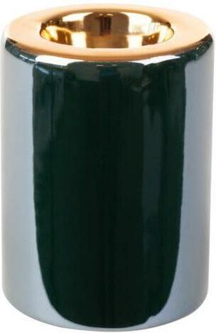 Świecznik dekoracyjny AMORA2 7x10 Eurofirany zielony złoty walcowaty lśniąc Eurofirany Zielony świecznik ceramiczny AMORA w nowoczesnym kształcie walca, o gładkiej lśniącej powierzchni, to efektowny dodatek do każdego wnętrza. Wnętrze świecznika, przeznaczone na włożenie świecy posiada ciepły złoty kolor. Odpowiednio dobrany świecznik doda blasku i stworzy atmosferę przytulności i relaksu we wnętrzu. Świecznik podkreśli też indywidualny styl twojego mieszkania. Świeczniki o rożnych kształtach i kolorach wspaniale uzupełnią aranżacją salonu czy pokoju dziennego. Kolacja przy świecach - jak najbardziej, ale znajdź godną oprawę dla swoich świec w postaci modnego świecznika. Świecznik lub zestaw świeczników to wspaniały element dekoracji każdego wnętrza: salonu, kuchni, holu czy przedpokoju. Świeczniki oraz lampiony doskonale prezentują się również na tarasie czy w ogrodowej altanie. Piękny świecznik to również świetny pomysł na oryginalny prezent z różnych okazji. Producent: Eurofirany Średnica: 7 cm, wysokość: 10 cm Kolor: zielony, złoty Skład: glinka ceramiczna Kolor: zielony Skład: glinka ceramiczna Rozmiar: 7x10