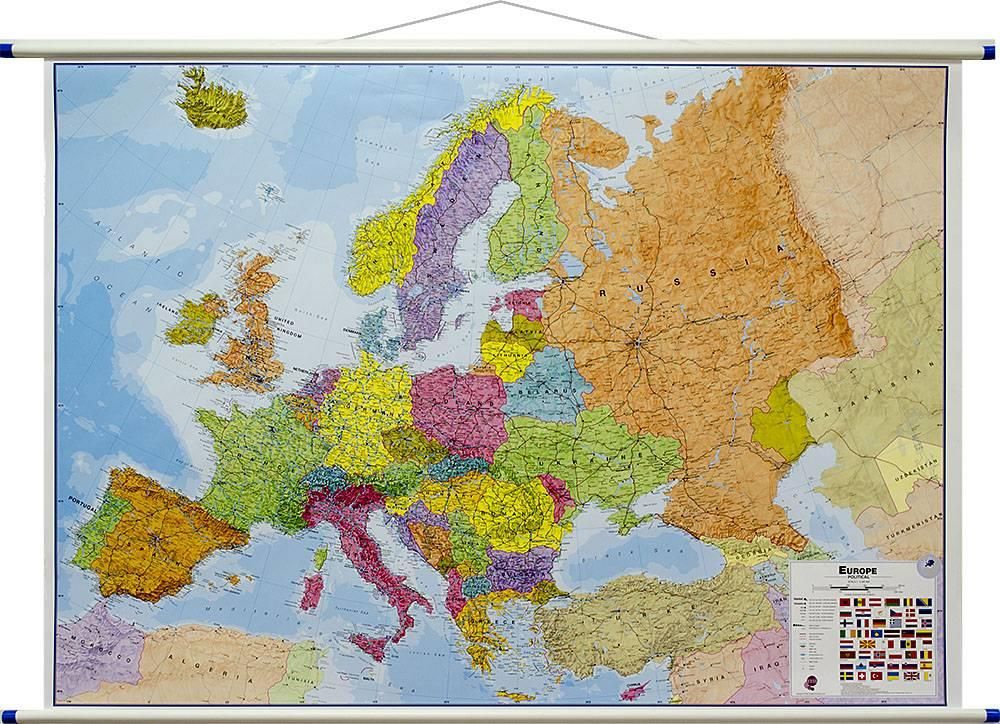 Europa polityczna mapa ścienna wydawnictwa Maps International to wyjątkowo czytelna i dokładna mapa. Skala 1:4 300 000 gwarantuje wysoką dokładność informacji jakie mapa przedstawia. Na mapie przestawiony jest podział polityczny, gdzie poszczególne kraje są wyraźnie od siebie oddzielone granicami i równocześnie rozróżnione kolorystycznie, przy użyciu nasyconych, wyraźnych barw. Zaznaczono na mapie również stolice i główne europejskie miasta. Dodatkowo widoczne są pasma górskie i szczyty, przy użyciu cieniowania, dającego efekt trójwymiarowości mapy. W dolnej części mapy umieszczone są również wszystkie flagi pastw europejskich. Mapa oprawiona jest w rurki PCV, laminowana dwustronnie, gotowa do zawieszenia.
