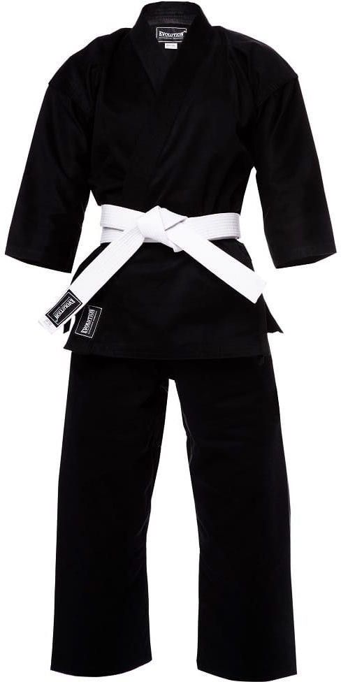 Kimono do Karate 8 OZ Evolution czarny Kimono do karate Evolution z białym pasem uszyte zgodnie z klasycznym wzorem . Wykonane z wysokiej jakości bawełny. Doskonale obszyte i skrojone. Wzmocnione dodatkowymi przeszyciami w miejscach najbardziej narażonych podczas treningu. Dla wygody zawodnika w pasie zastosowano gumkę. Strój jest łatwy w utrzymaniu w czystości. Można prać w pralce.