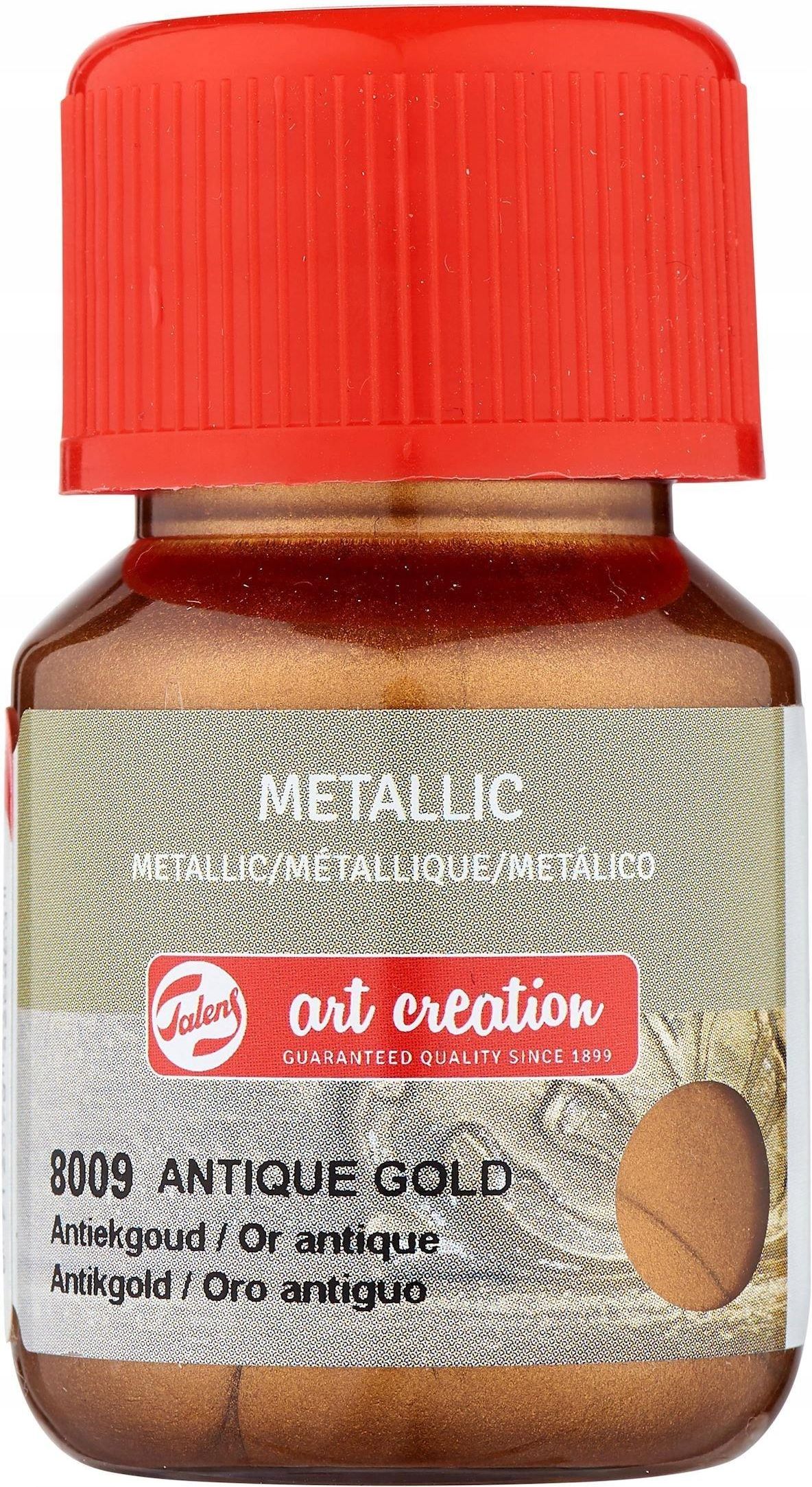 Farba metaliczna - Talens - Antique Gold, 30 ml Szybkoschnące farby metaliczne z serii Metallic od Talens Art Creations. Sprawdzą się do malowania na papierze, plastiku, styropianie, drewnie, i wielu innych powierzchniach. Farby te dzięki kremowej konsystencji nadają się do wykańczania detali, jak i pokrywania większych powierzchni. Nadają one powierzchniom wyjątkowy, metaliczny połysk. Po całkowitym wyschnięciu stają się wodoodporne. Ważny aspektem pracy z farbą metaliczną jest odpowiednie wyczyszczenie i odtłuszczenie powierzchni. Na tak przygotowaną powierzchnię można nakładać farbę za pomocą pędzelka lub gąbeczki. KOLOR: złoty antyczny (Antique Gold 8009) POJEMNOŚĆ: 30 ml OPAKOWANIE: 1 szt.