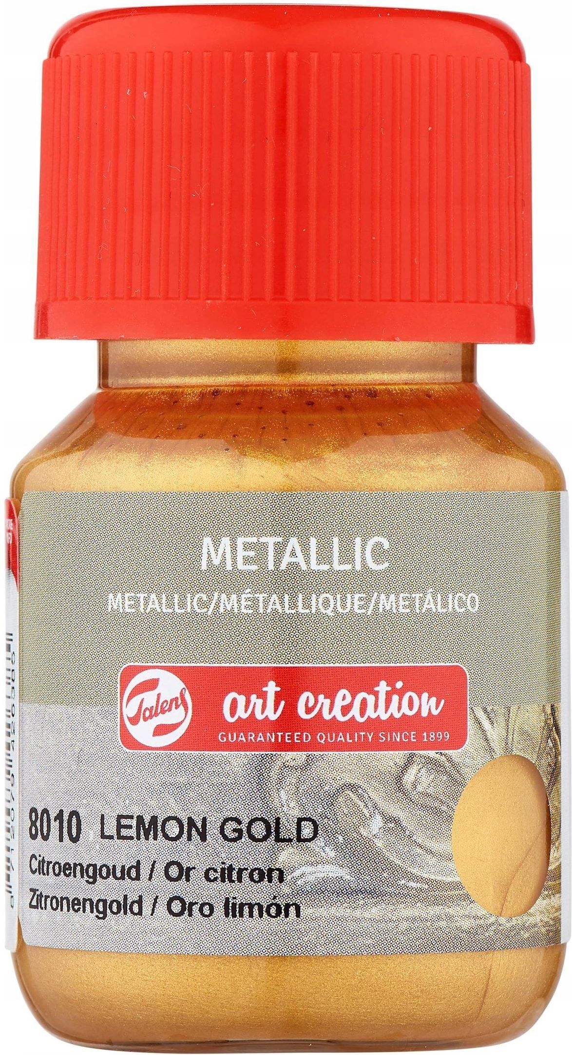 Farba metaliczna - Talens Art - Lemon Gold, 30 ml Szybkoschnące farby metaliczne z serii Metallic od Talens Art Creations. Sprawdzą się do malowania na papierze, plastiku, styropianie, drewnie, i wielu innych powierzchniach. Farby te dzięki kremowej konsystencji nadają się do wykańczania detali, jak i pokrywania większych powierzchni. Nadają one powierzchniom wyjątkowy, metaliczny połysk. Po całkowitym wyschnięciu stają się wodoodporne. Ważny aspektem pracy z farbą metaliczną jest odpowiednie wyczyszczenie i odtłuszczenie powierzchni. Na tak przygotowaną powierzchnię można nakładać farbę za pomocą pędzelka lub gąbeczki. KOLOR: złoty (Lemon Gold 8010) POJEMNOŚĆ: 30 ml OPAKOWANIE: 1 szt.