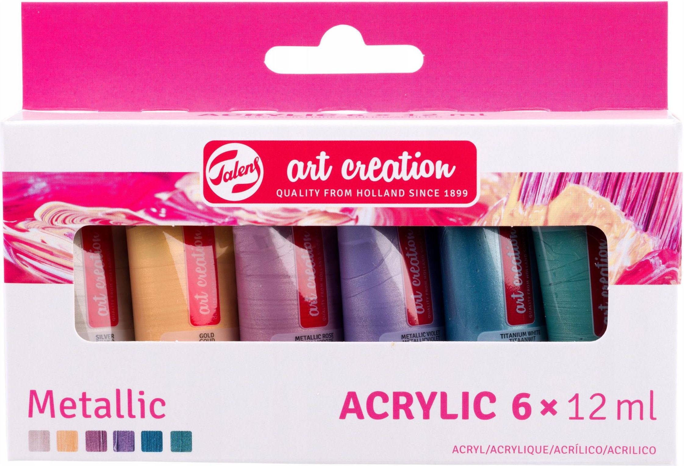 Farby akrylowe ArtCreation Metallic Set 6 x 12 ml - plastikowe tubki Zestaw 6 tubek farb akrylowych o pojemności 12 ml oferuje paletę metalicznych kolorów do tworzenia różnych obrazów. Ze względu na niewielki rozmiar, tubki są łatwe do przechowywania i idealne do zabierania w podróż. Farby Art Creation firmy Talens składają się w pełni z żywicy akrylowej, mają gęstą konsystencję, szybko schną i nabierają jedwabistego połysku po wyschnięciu. Farby te można używać bezpośrednio z tubki lub rozcieńczać wodą i po wyschnięciu są wodoodporne. Są to wszechstronne farby, które można stosować na niemal każdej powierzchni, o ile jest ona chłonna, wolna od tłuszczu i kurzu, takiej jak płótno, papier, gips, płytka pilśniowa, drewno, kamień i cement. Zestaw zawiera 6 tubek farb akrylowych Art Creation o pojemności 20ml w metalicznych kolorach: 800 Silver, 801 Gold, 833 Metallic Rose, 835 Metallic Violet, 834 Metallic Blue, 836 Metallic Green.