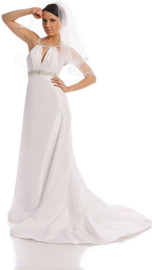 Fason: prosta, tren Dekolt przód: szpic Plecy: odkryte Zapięcie: suwak kryty z tyłu Ozdoby: kamienie, koraliki, cekiny, cyrkonie, perełki Materiał: tafta