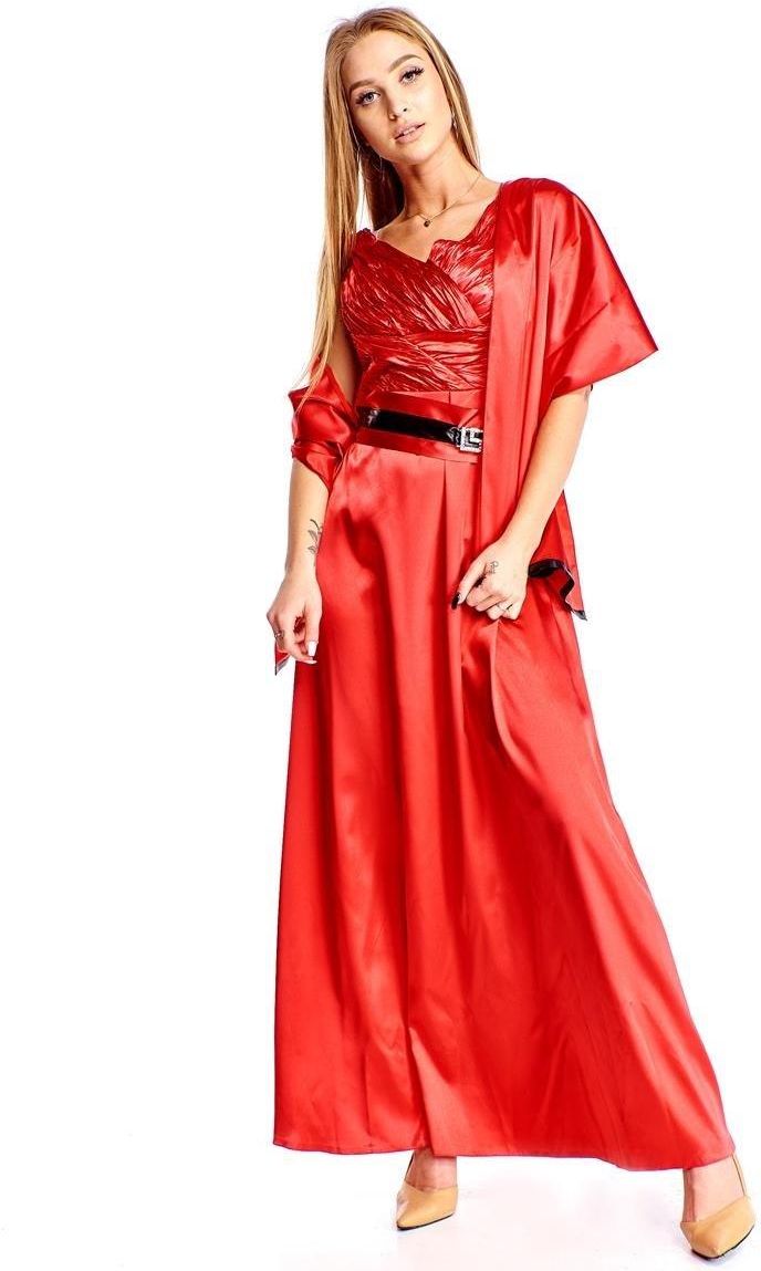 Fason: rozkloszowana, odcięta w pasie Dekolt przód: dekolt szpic Plecy: dekolt szpic Zapięcie: suwak kryty z tyłu Materiał: tkanina elastyczna - satyna Długość całkowita: maxi Rękaw: brak Ozdoby: klamra, draperia