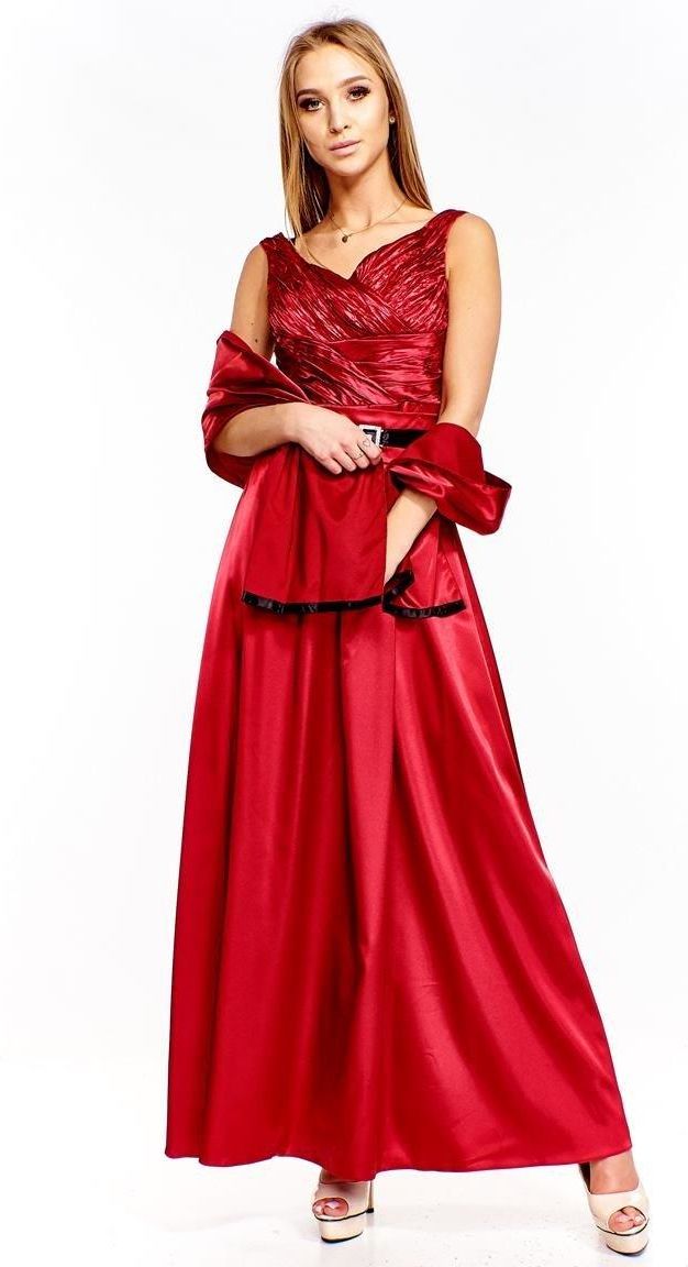 Fason: rozkloszowana, odcięta w pasie Dekolt przód: dekolt szpic Plecy: dekolt szpic Zapięcie: suwak kryty z tyłu Materiał: tkanina elastyczna - satyna Długość całkowita: maxi Rękaw: brak Ozdoby: klamra, draperia