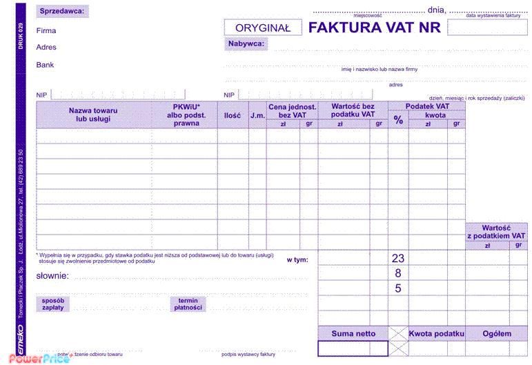 EmekoFaktura A5 Netto(1+1)TYP: 029. format: A5. rodzaj papieru: samokopiujący. oprawa: bloczek 80 kartek. druk: jednostronny (oryginał + 1 kopia). zastosowanie: faktury, rachunki, dowody sprzedaży