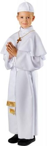 Zmień swój wizerunek wcielając się w osobę duchowną. Na pewno nikt Cię nie rozpozna. Zestaw papieża zawiera: pas zapinany na rzep czapkę (piuska) Materiał: tkanina poliestrowa. Biały pas ze złotymi frędzlami oraz biała czapeczka doskonale upodobnią Cię do postaci Papieża. Strój sprawi, że poczujesz się jak prawdziwa osoba duchowna.