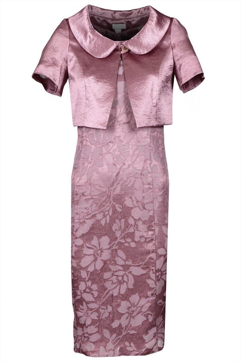 Sukienka: midi, prosta dekolt okrągły szerokie ramiączka suwak kryty z tyłu rozporek z tyłu tkanina wzorzysta, podszewka Żakiet: krótki kołnierz okrągły zapięcie guzik rękaw krótki tkanina atłas