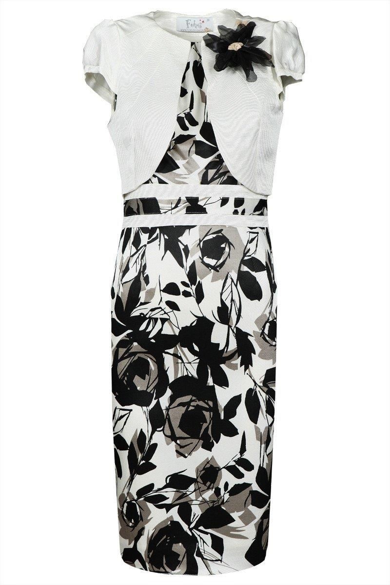Sukienka: midi, odcięta w pasie dekolt okrągły szerokie ramiączka suwak kryty z tyłu rozporek z tyłu tkanina w prążki wzorzysta, podszewka Bolerko: bez zapięcia rękaw krótki, bufka ozdoba kwiat tkanina w prążki, podszewka