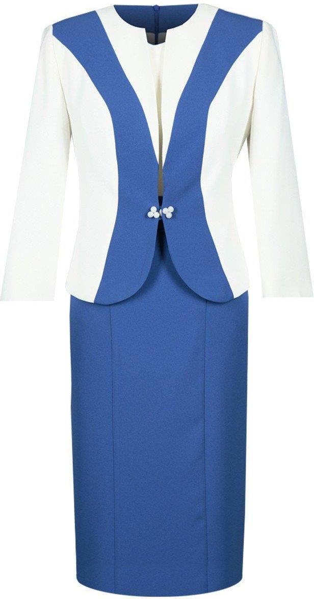 Sukienka: midi, prosta, odcięta w pasie dekolt półokrągły rękaw krótki suwak kryty z tyłu rozporek z tyłu tkanina elast - krepa, podszewka Żakiet: kontrast. wstawki zapięcie guzik, perełki rękaw 3/4 tkanina elastyczna - krepa, podszewka