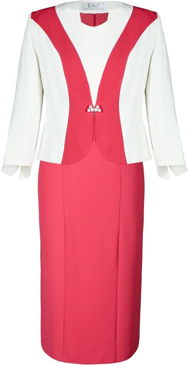 Sukienka: midi, prosta, odcięta w pasie dekolt półokrągły rękaw krótki suwak kryty z tyłu rozporek z tyłu tkanina elast - krepa, podszewka Żakiet: kontrast. wstawki zapięcie guzik, perełki rękaw 3/4 tkanina elastyczna - krepa, podszewka