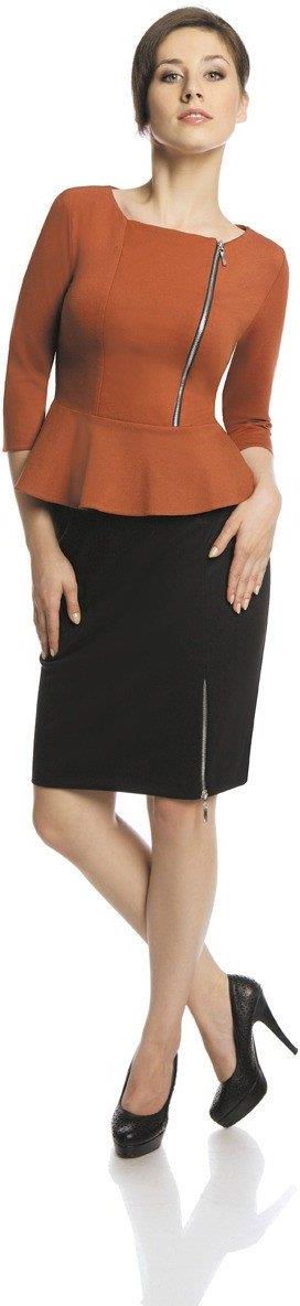 Spódnica: midi, prosta suwak kryty z tyłu pęknięcie z przodu metalowy suwak z przodu dzianina matowa Bluzka: odcięta w pasie, baskinka dekolt okrągły, fantazyjny suwak kryty z tyłu rękaw 3/4 suwak metalowy z przodu dzianina matowa