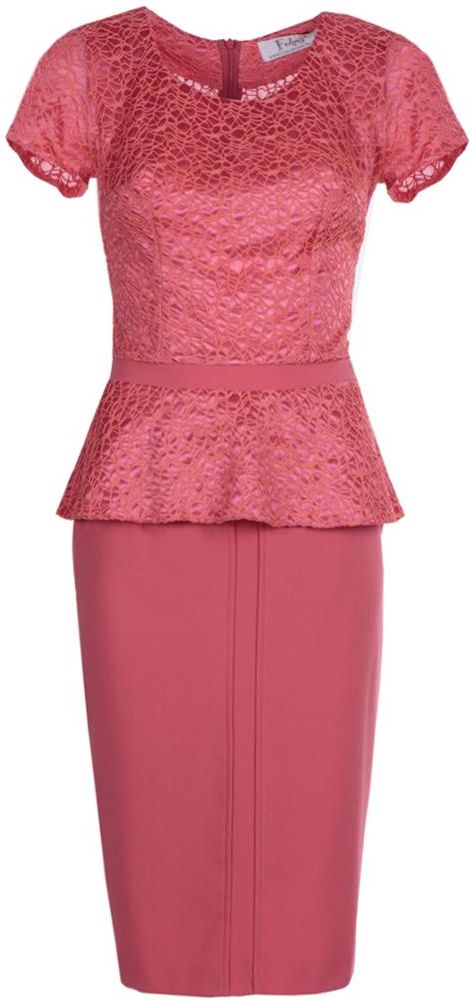 Spódnica: midi, prosta suwak kryty z tyłu rozporek z tyłu tkanina elastyczna - krepa, podszewka Bluzka: odcięta w pasie, baskinka dekolt okrągły suwak kryty z tyłu rękaw krótki dzianina strukturalna - koronka