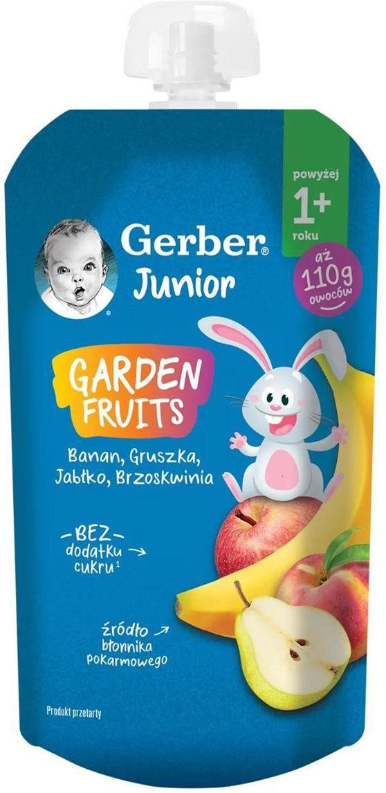Gerber Junior GARDEN FRUITS banan, gruszka, jabłko, brzoskwinia Deserek Gerber GARDEN FRUITS to aż 110 g owoców zamkniętych w wygodnej tubce! W środku znajdziesz przetarte znane i lubiane owoce przygotowane z myślą o dzieciach  po 1. roku życia. Ta wspaniała przekąska bez dodatku cukru¹ jest cennym źródłem błonnika. Wśród wybranych owoców znalazł się banan, gruszka, a także jabłko i brzoskwinia! Odkryj zalety produktu GARDEN FRUITS Banan, Gruszka, Jabłko, Brzoskwinia to świetna owocowa przekąska dla Juniora powyżej 1. roku życia. Jest zamknięta w poręcznej tubce, która przed otwarciem nie wymaga przechowywania w lodówce. Dzięki temu można zabrać ją ze sobą na spacer lub w podróż i podać Dziecku w dowolnym momencie. Deserek jest źródłem błonnika i nie zawiera dodatku cukru¹. Starannie wyselekcjonowane owoce pochodzą od sprawdzonych dostawców. Tabela Wartości odżywczych i składniki produktu  Składniki banan (42 %), gruszka (37,2%), jabłko (15,4%), brzoskwinia (5 %), zagęszczony sok cytrynowy, witamina C. Gramatura Masa netto: 110 g Opakowania Żywność przeznaczona dla małych dzieci. Produkt utrwalony termicznie, pasteryzowany. Nowa tubka Gerber IncredipouchTM zaprojektowana jest z myślą o przyszłym recyklingu dzięki użyciu jednego typu materiału. Dodatkowe informacje Wyciśnij zawartość bezpośrednio na łyżeczkę. Dzieci po 12. miesiącu życia mogą spożywać produkt bezpośrednio z tubki. Produkt podawaj dziecku w pozycji siedzącej, pod kontrolą dorosłego. Zachowaj zasady bezpieczeństwa Nakrętkę należy trzymać poza zasięgiem dziecka. Nie używaj, jeżeli opakowanie jest uszkodzone lub napuchnięte. Nigdy nie podgrzewaj tubki z produktem w kuchence mikrofalowej. Produkt przechowuj w temperaturze pokojowej. Po otwarciu przechowuj w lodówce nie dłużej niż 24 godziny. Najlepiej spożyć przed końcem: patrz data na opakowaniu. Poznaj wszystkie produkty linii Gerber Jeśli Twoje dziecko spróbowało już deserku w tubce Gerber Junior GARDEN FRIUITS Banan, Gruszka, Jabłko, Brzoskwinia, możesz zapoznać zaproponować mu także inne produkty Gerber i Gerber Organic!