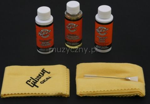 Zestaw małego czyściocha dla fanów Gibsonów. Specjalny płyn do nitrocelulozowego lakieru? Dla mnie bomba. Płyn do podstrunicy i metalowych części zapewni waszemu Gibsonowi dłuższe życie w dobrej formie. Ściereczki w sumie też fajne.