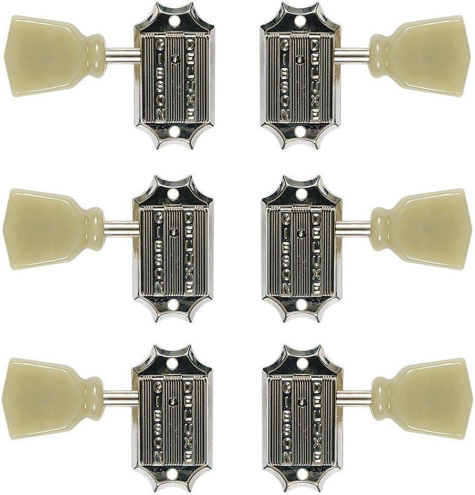 Gibson Klucze Vintage Nickel / Pearl PMMH-010 – styl i funkcjonalność w jednym Gibson PMMH-010 to zestaw wysokiej jakości kluczy gitarowych, które łączą klasyczny styl z niezawodną funkcjonalnością. Wykończenie w kolorze niklu oraz eleganckie perłowe przyciski nadają produktowi wyjątkowy, vintage’owy charakter. Klucze te są doskonałym wyborem dla gitarzystów chcących odnowić swoją gitarę lub poprawić stabilność strojenia bez rezygnowania z estetyki klasycznego instrumentu. Cechy produktu Wykończenie: niklowane Perłowe przyciski (tzw. guziki) Komplet do pełnej wymiany kluczy w gitarze Estetyka w stylu vintage – pasuje do gitar typu Les Paul, SG, Explorer Produkt oryginalny – marka Gibson Mechanika strojenia, która robi różnicę Klucze Gibson PMMH-010 zapewniają precyzyjne strojenie i trwałość nawet przy intensywnym użytkowaniu. Niklowane wykończenie jest odporne na korozję, a perłowe przyciski sprawiają, że instrument prezentuje się wyjątkowo stylowo. Idealne do klasycznych modeli gitar – zachowują charakter vintage, jednocześnie zapewniając nowoczesny komfort użytkowania. Do czego pasują? Do gitar elektrycznych marki Gibson Idealne jako zamiennik oryginalnych kluczy Również dla lutników i osób budujących gitary od podstaw Szczegółowe dane techniczne Producent: Gibson Model: PMMH-010 Typ: klucze gitarowe (mechaniki) Wykończenie: nikiel Przyciski: perłowe Zestaw: komplet na 6 kluczy Styl: vintage Materiały i budowa Obudowa wykonana z trwałego metalu pokrytego niklem. Przyciski wykonane z tworzywa o perłowej strukturze. Mechanizmy pracują płynnie, z wyczuwalnym oporem, co zapewnia stabilność strojenia. Produkt jest lekki, ale wytrzymały – nie wpływa negatywnie na balans główki gitary. W zestawie 6 x klucz gitarowy Gibson Vintage Nickel / Pearl Śruby montażowe Oryginalne opakowanie Dlaczego warto wybrać ten produkt? Jeśli szukasz wysokiej jakości zamiennika oryginalnych kluczy w swojej gitarze Gibson, model PMMH-010 to doskonały wybór. Zachowuje klasyczny wygląd instrumentu, oferując jednocześnie niezawodne działanie i trwałość. Estetyczne wykończenie i zgodność z klasycznymi modelami Gibson czynią ten zestaw idealnym wyborem dla wymagających gitarzystów.