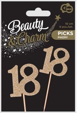 Pikery dekoracyjne w motywie urodzinowym ze wzorem "18" w kolorze złotym. W zestawie znajduje się 6 sztuk. Idealne na babeczki lub ciasta, aby zaznaczyć motyw przewodni uroczystości. Stwórz dekoracje, której każdy będzie ci zazdrościć wiele tygodni. Warto również pamiętać że minimalne akcenty dekoracyjne przykuwają uwagę najbardziej. Pikery dekoracyjne na babeczki i nie tylko dodadzą dodatkowego uroku każdemu wypiekowi. Dostępne są w różnych kształtach, rozmiarach i kolorach, co pozwala na tworzenie niepowtarzalnych i oryginalnych dekoracji. Szybkie do usadowienia w wypieku i nie tylko. Możliwość użycia jako dekoracja na tort. Możliwość użycia jako dekoracja do bukietu kwiatów. Często zastosowanie znajduje na babeczkach.