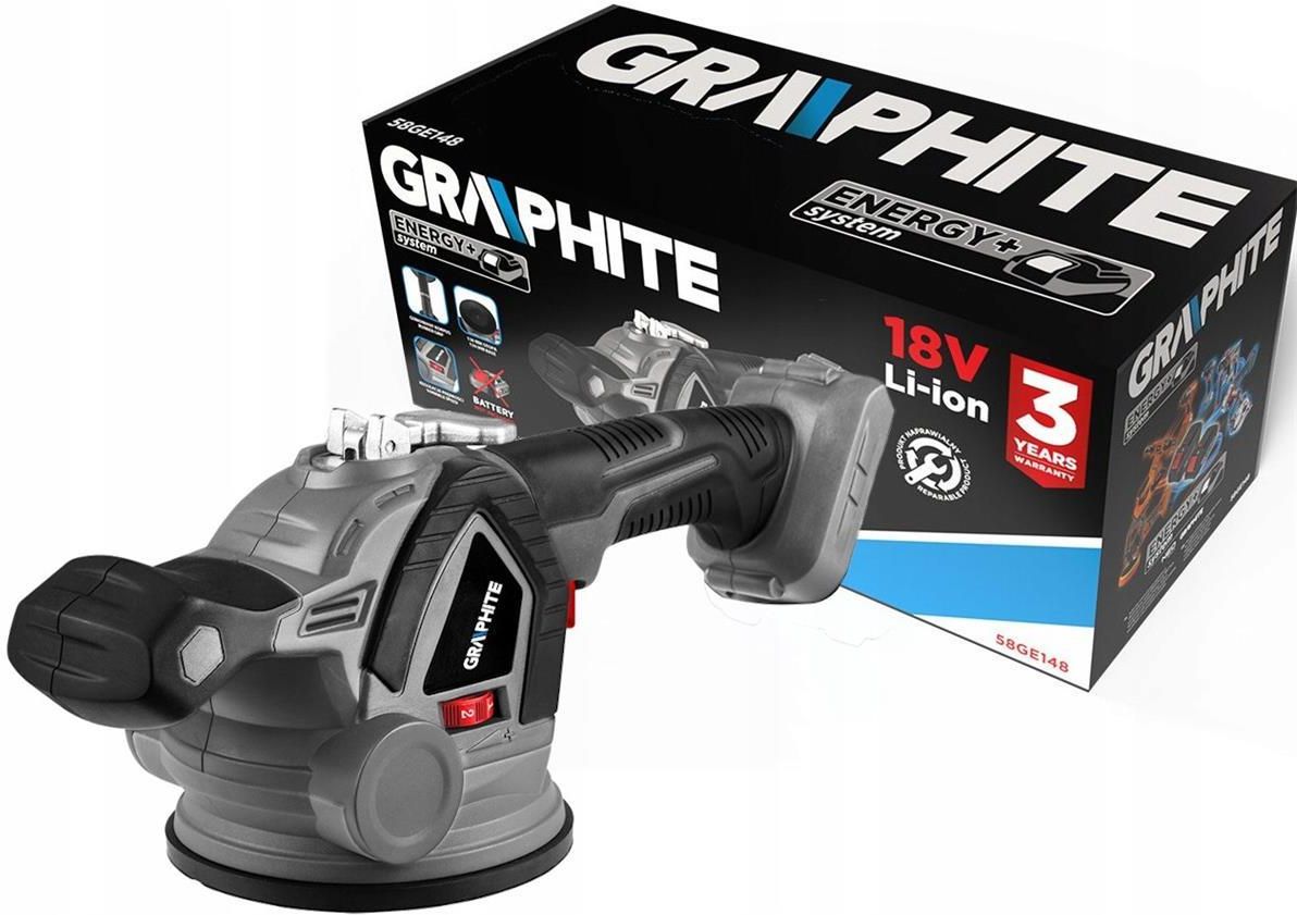 PRZYSSAWKA DO PŁYTEK AKUMULATORA ENERGY+ 18V Do 50kg GRAPHITE 58GE148 PRZYSSAWKA DO PŁYTEK ENERGY+ 18V, SOLO (BEZ AKUMULATORA I ŁADOWARKI) GRAPHITE 58GE148 Zastosowanie Zagęszczanie zaprawy podczas układania płytek ceramicznych i kamiennych. Dopasowywanie płytek, umożliwiające idealne wyrównanie i eliminację nierówności. Przenoszenie dużych i ciężkich elementów do 50 kg, takich jak płytki, lustra, tafle szkła czy płyty z tworzyw sztucznych. Precyzyjne prace wykończeniowe w łazienkach, kuchniach oraz innych pomieszczeniach. Wsparcie w przenoszeniu i montażu delikatnych elementów, które wymagają stabilności i ochrony przed uszkodzeniem. Zastosowanie w środowiskach domowych i ogrodowych, np. przy montażu dekoracji szklanych lub kamiennych. Prace w profesjonalnych i amatorskich projektach budowlanych, gdzie liczy się dokładność i wygoda obsługi. Cechy produktu przyssawka do płytek, urządzenie akumulatorowe Energy+, rozmiar stopy: 130 mm, regulowana częstotliwość wibracji w zakresie 0 – 7500/min-1, regulacja: min-1-2-3-4-5-max, siedmiostopniowa skala dostosowania prędkości, ergonomiczny kształt, ogumowany korpus, waga: 1,1 kg. Obsługa ciężarów do 50 kg. Materiał wzmocnione włókno PA6GGF30, guma TPE. Przyssawka GRAPHITE kompatybilna z akumulatorami akumulator Energy+ 18 V, Li-Ion 2.0 Ah 58G001-1 GRAPHITE, akumulator Energy+ 18 V, Li-Ion 4.0 Ah BOOST UP 58G004-1 GRAPHITE, akumulator Energy+ 18 V, Li-Ion 6.0 Ah BOOST UP 58G086-1 GRAPHITE, akumulator Energy+ 18 V, Li-Ion 8.0 Ah BOOST UP 58GE152 GRAPHITE. Czas pracy na akumulatorach 2 Ah – 55 minut, 4 Ah – 110 minut, 6 Ah – 165 minut, 8 Ah – 230 minut. Przyssawka do płytek 18 VEnergy+ marki GRAPHITE to innowacyjne narzędzie zaprojektowane z myślą o precyzyjnym układaniu płytek i przenoszeniu dużych, płaskich elementów, takich jak lustra czy tafle szkła. Wyposażona w ogumowaną stopę o rozmiarze 130 mm i dostosowana do maksymalnego udźwigu 50 kg, zapewnia pewne mocowanie na różnych powierzchniach. Funkcja regulacji prędkości wibracji (od 0 do 7500/min-1) umożliwia dostosowanie działania do specyfiki zadania, zapewniając efektywne zagęszczanie zaprawy i dokładne dopasowywanie płytek podczas ich układania. Wykonana z wzmocnionego włókna PA6GF30 i wyposażona w ogumowy korpus z materiału TPE, przyssawka marki GRAPHITE jest trwała i wygodna w użytkowaniu. Ergonomiczny kształt i lekka konstrukcja o wadze 1,1 kg ułatwiają obsługę narzędzia. Urządzenie jest przystosowane do pracy z akumulatorami ENERGY+ 58G001-1, 58G004-1, 58G086-1 i 58GE152, a czas pracy zależnie od akumulatora wynosi od 55 do 230 minut. To niezastąpiony sprzęt dla budowlańców i majsterkowiczów, zapewniający precyzję oraz wygodę w codziennych zadaniach budowlanych i wykończeniowych.