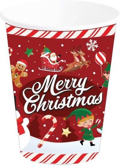 Świąteczne kubeczki papierowe "Merry Christmas" Zestaw 6 świątecznych kubeczków papierowych o pojemności 240 ml, które wprowadzą radosny nastrój na każde bożonarodzeniowe przyjęcie! Każdy kubeczek zdobią urocze motywy: sanie Mikołaja, ciasta, świąteczne lizaki-laski, wesołe elfy oraz napis "Merry Christmas". Te kolorowe i wesołe wzory doskonale oddają magię świąt, tworząc ciepłą atmosferę przy każdym napoju. Wykonane z wysokiej jakości, ekologicznego papieru, dzięki czemu są przyjazne dla środowiska i bezpieczne w użyciu. Rozświetl swoje święta z tymi wyjątkowymi kubeczkami!