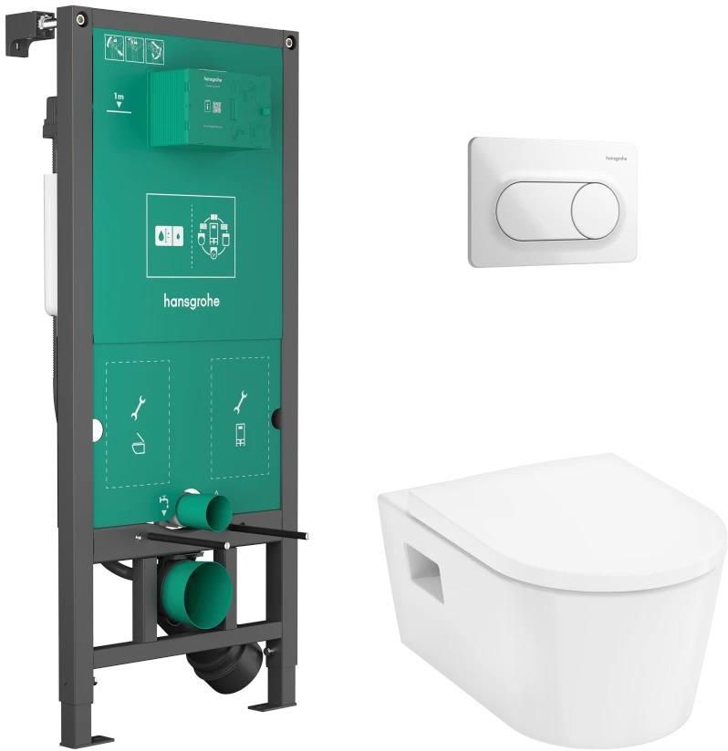 składa się z: miska wisząca WC, deska WC z pokrywą, przycisk spłukujący do stelaża, stelaż podtynkowy obszar stosowania: strefa toalety Miska WC materiał: ceramika stopień połysku: błyszcząca typ spłukiwania: standardowe położenie odpływu: odpływ wody poziomy bezkołnierzowa Przycisk spłukujący do stelaża dla 2-objętościowego systemu spłukiwania mechaniczny Stelaż podtynkowy rozstaw osi montażu WC: 180 mm, 230 mm regulowana głębokość: 75–115 mm typ ściany: zabudowa lekka średnica zewnętrzna rury, odpływ: 90 mm Stelaż jest wyposażony w system pakowania elementów montażowych, który porządkuje i eksponuje cały potrzebny sprzęt instalacyjny. Zestaw zawiera mocowanie ścienne ułatwiające instalację. Spełnia normy obciążeniowe 400 kg. Niezawodny mechaniczny system spłukujący. Objętość spłukiwania wstępnie ustawiona pod kątem misek WC hansgrohe w celu uzyskania najlepszej wydajności. Zbiornik fabrycznie ustawiony na spłukiwanie na 6 l i 3 l. Możliwość redukcji zużycia wody przy dużym spłukiwaniu. Rozstawy montażowe pasujące do wszystkich standardowych misek wiszących. Odizolowany, szczelny kanał dla misek WC z funkcją bidetu lub desek myjących. Pionowe wzmocnienie umożliwiające montaż krótkich misek Nóżki wyposażone w zintegrowane hamulce, które zapewnią łatwą instalację wykonaną przez jedną osobę. Wsporniki w zestawie brak możliwości montażu kostkarki Zakres dostaw stelaż podtynkowy element montażowy rura odpływowa zawór wlotowy zawór odpływowy instrukcja montażu wsporniki