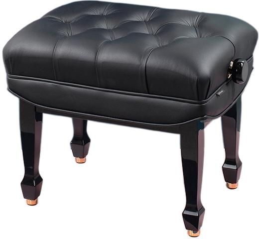- Regulacja wysokości naszym niepowtarzalnym mechanizmem Hidrau Tech. - Wykonana z litego drewna bukowego i polakierowana poliesterem. - Ręcznie wykonane siedzisko pikowane, z 13 guzikami i specjalną pianką o wysokiej gęstości. - Posiada dekoracyjną obudowę siedziska, ktora zakrywa mechanizm. - Nógi w stylu fortepianowym wyposażone w gumowe nakrętki poziomujące z ozdobnymi pierścieniami wykończonymi w kolorze zlotym lub srebrnym. - Ławę można wyprodukować w dowolnej kombinacji kolorystycznej dla drewna i siedziska z palety kolorów firmy. Obicie: Czarna skóra Nogi: Czarny połysk