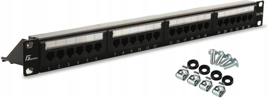 PATCH PANEL UTP CAT.5E 24 PORTY PGF-5EUTP24-B4 GETFORT Najważniejsze cechy Rodzaj: UTP Ekranowanie: Nieekranowany Kategoria: Cat.5e Rodzaj łącza: RJ45 Ilość portów: 24 Wysokość: 1U Szerokość: 19" Listwa wspierająca Mocowanie: Doczołowe do szyn rack Zestaw montażowy w komplecie Opis Patch panele …