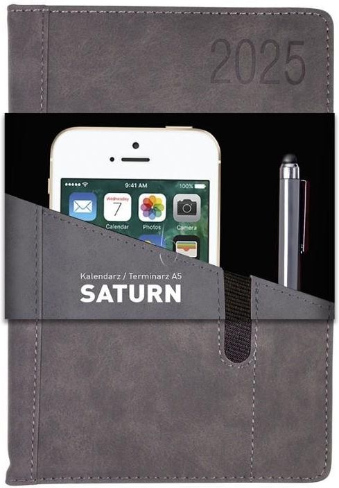 Kalendarz 2025 książkowy A5 dzienny registry drukowane z kieszonką na okładce Opus Saturn kol. czarny Łódź