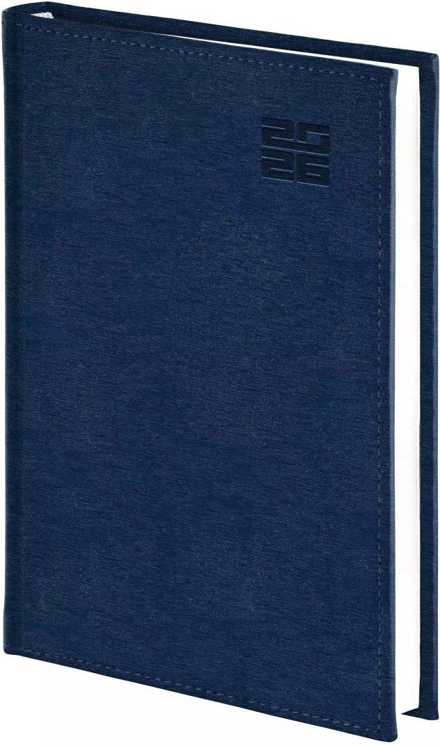 Kalendarz 2026 A4 dzienny Aluminium, granatowy Kalendarz w oprawie z materiału o strukturze szczotkowanej stali - Aluminium. Drukowany na białym papierze; bloki terminarza szyte nićmi; kapitałka i tasiemka białe; przejrzysty układ graficzny kalendarium; rozbudowana część informacyjna; oprawa …